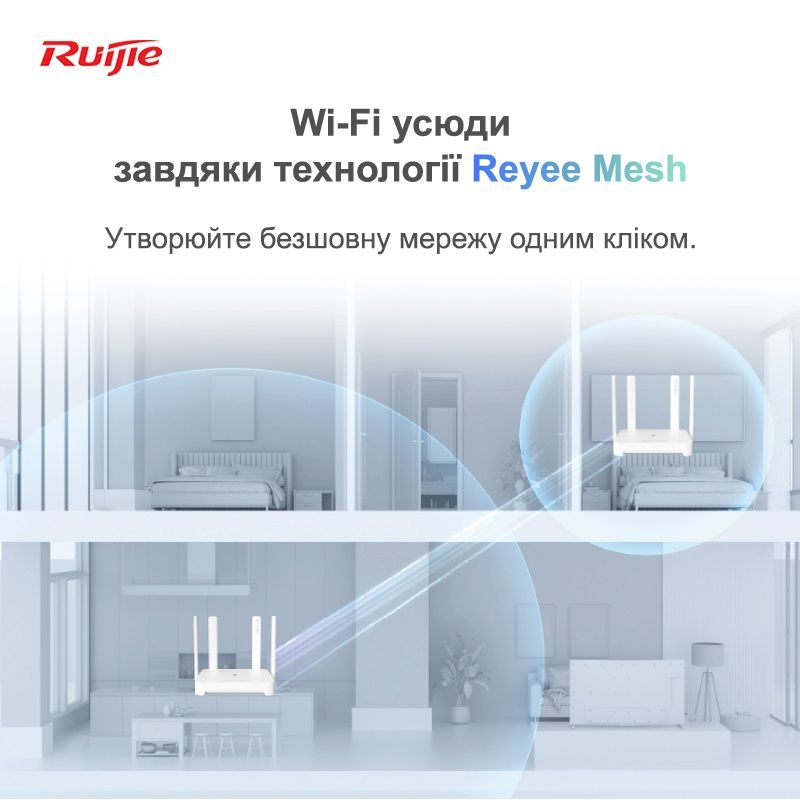 Технологія Ruijie Reyee Mesh дозволяє швидко підключати декілька маршрутизаторів без кабелю чи конфігурації. Таким чином, сигнали Wi-Fi можуть охоплювати все більші плоскі поверхи, комплексні одиниці, дуплекси та вілли. Крім того, підтримуються гібридні пористі мережі з усім сімейством пористих маршрутизаторів серії EW. Алгоритм налаштування RF, що застосовується до мільйонів точок доступу корпоративного рівня Ruijie, може забезпечити безперешкодний роумінг між пристроями. Користувачі можуть переміщатися зоною покриття Wi-Fi без переривання обслуговування.