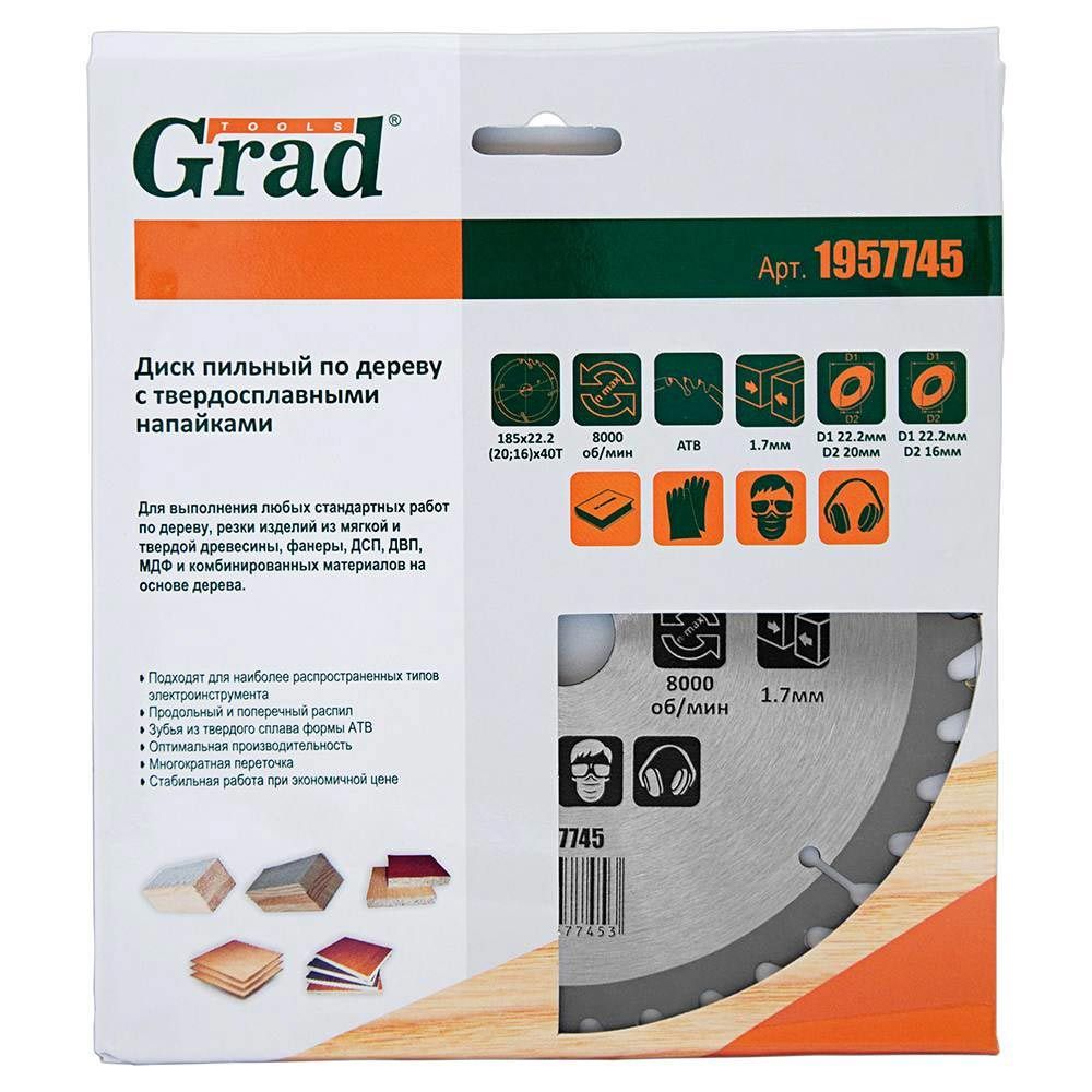 Диск пиляльний по дереву з твердосплавними напайками Ø185×22.2 (20; 16)×40Т, 8000об/хв GRAD (1957745)