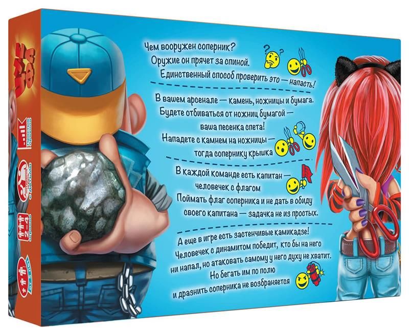 На ігровому полі в сутичці сходяться команди. У кожної фігурки в кулаці за спиною затиснутий предмет: камінь, ножиці або папір. Чим озброєний суперник? Зброю він ховає за спиною. Єдиний спосіб перевірити це - напасти!