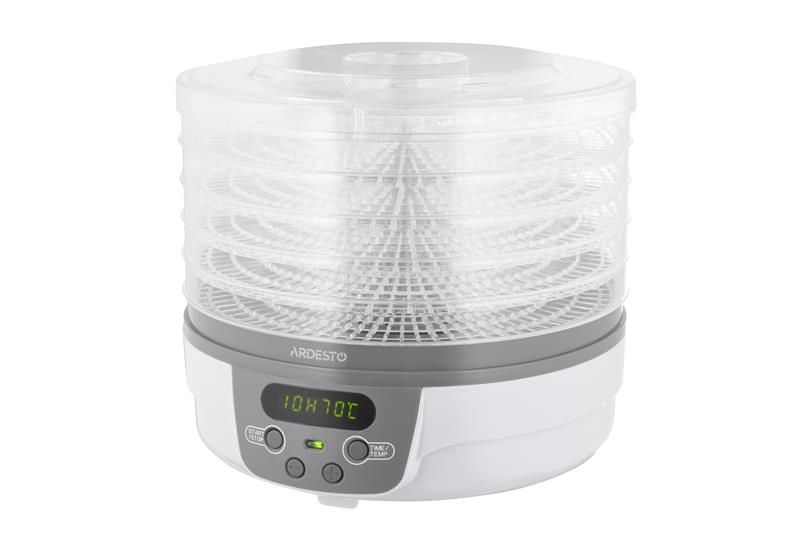 ARDESTO FDB-5321T білого кольору із сірою основою. Її кришка з отворами для повітря та п’ять піддонів діаметром 32 см та висотою 3 см – прозорі, що зручно для стеження за процесом сушіння.