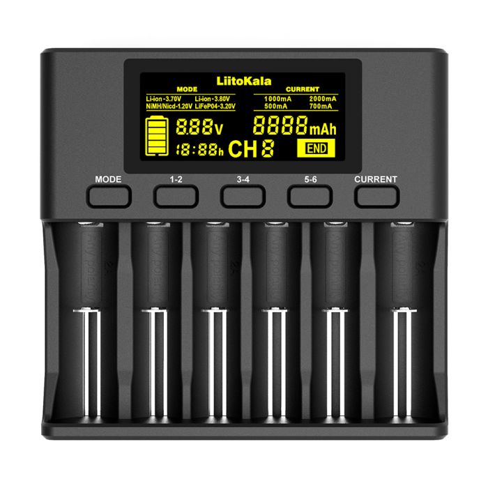 Універсальний зарядний пристрій з 6 незалежними каналами для акумуляторів Ni-MH/ Ni-Cd/Li-ion/LiFePO4, цифровим LED дисплеєм, вибором струму заряду, м’ягким стартом і автоматичним визначенням полярності встановлених елементів. Живлення від мережі ~ 220V або DC 12V.