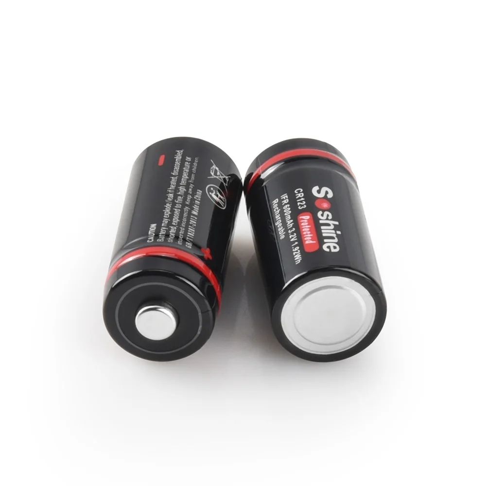 Циліндричний Літій-залізо-фосфатний (LiFePO4) акумулятор Soshine RCR123P-3.2-600 із встановленою платою захисту та виступаючим "+" контактом (Button top).