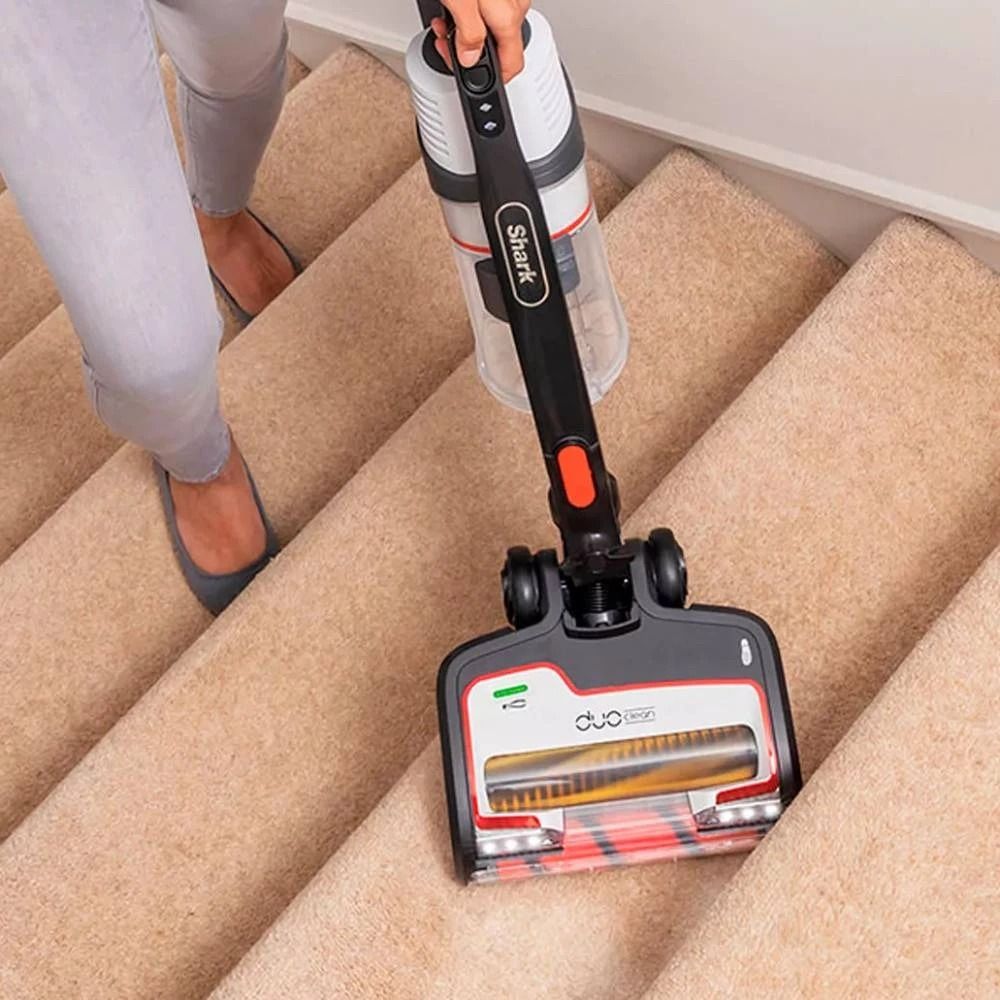 Фірмова насадка для прибирання DuoClean від Shark поєднує в собі дві моторизовані щітки-вали, що разом очищають килими, і тверді підлоги. Пилосос плавно ковзає всіма типами підлог без необхідності зупинятися або змінювати насадку. Щетинки одного глибоко проникають у килимові покриття, видаляючи з них бруд і волосся, а м'який валик другого втягує більше сміття, дрібні частки та піднімає пил із твердих підлог.