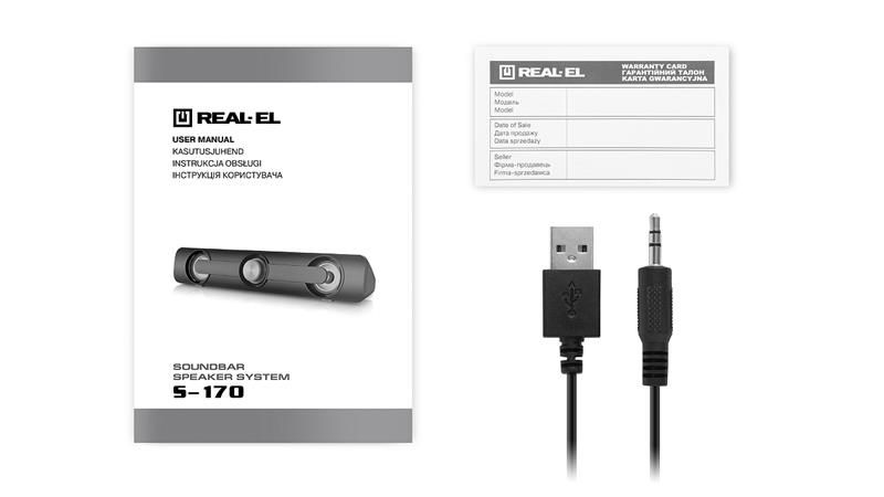 Акустична система REAL-EL S-170 оснащена вмонтованими підсилювачем, кабелем живлення та сигнальним кабелями, завдяки чому може бути підключена практично до будь-яких джерел аудіосигналу. Живлення саундбару здійснюється через USB-порт 5V DC за допомогою вмонтованого USB-кабелю живлення.