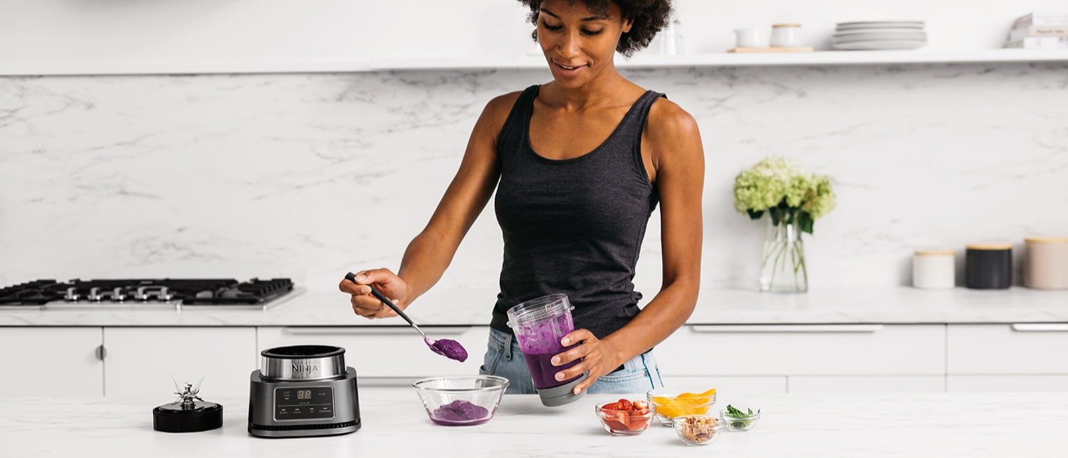 З блендером Ninja ви отримаєте смачні десерти, соуси, заправки, сорбети та коктейлі. Потужний двигун 1100 Вт і унікальна конструкція лез дають змогу поєднувати свіжі та заморожені інгредієнти, а книга з рецептами надихне вас на створення найяскравіших шедеврів.