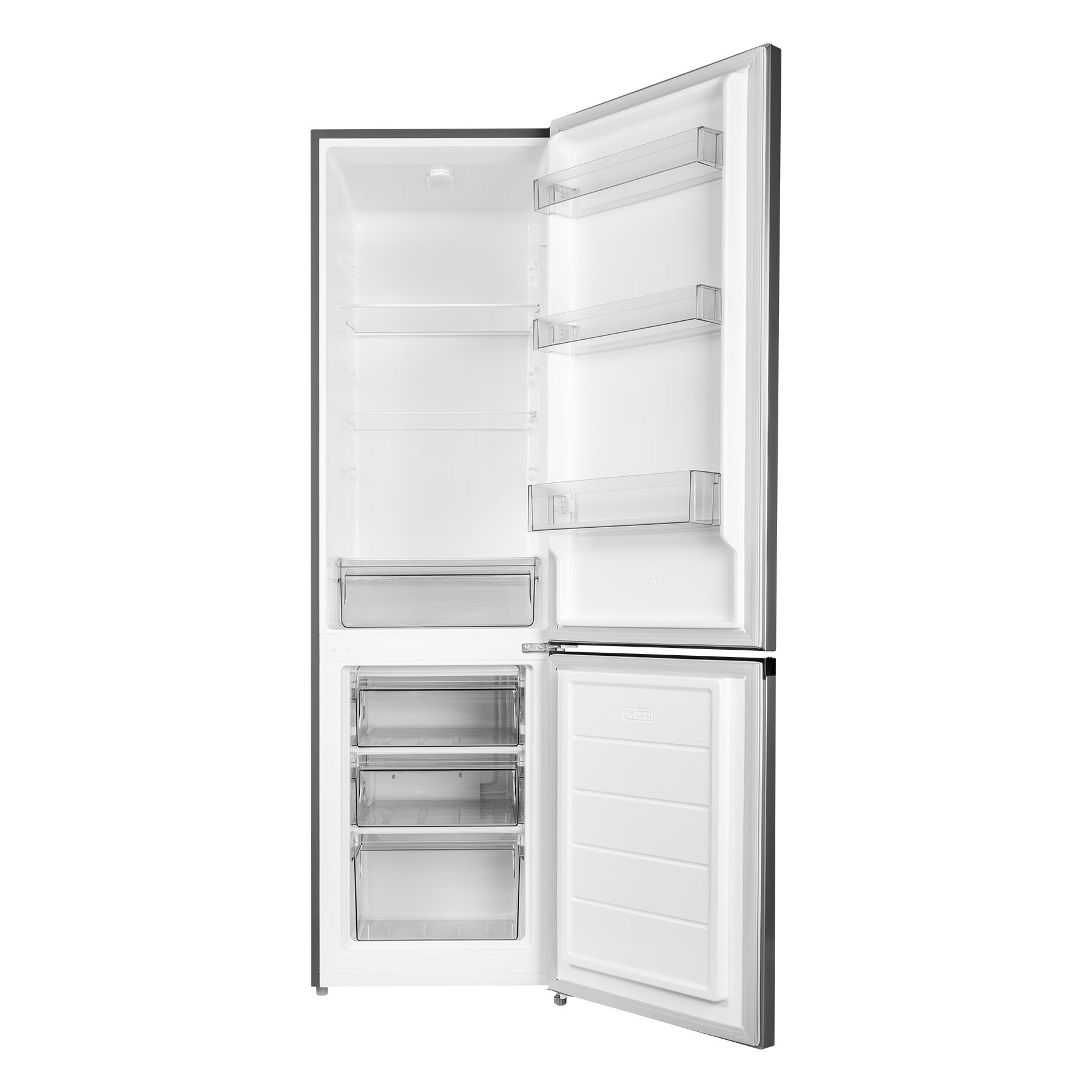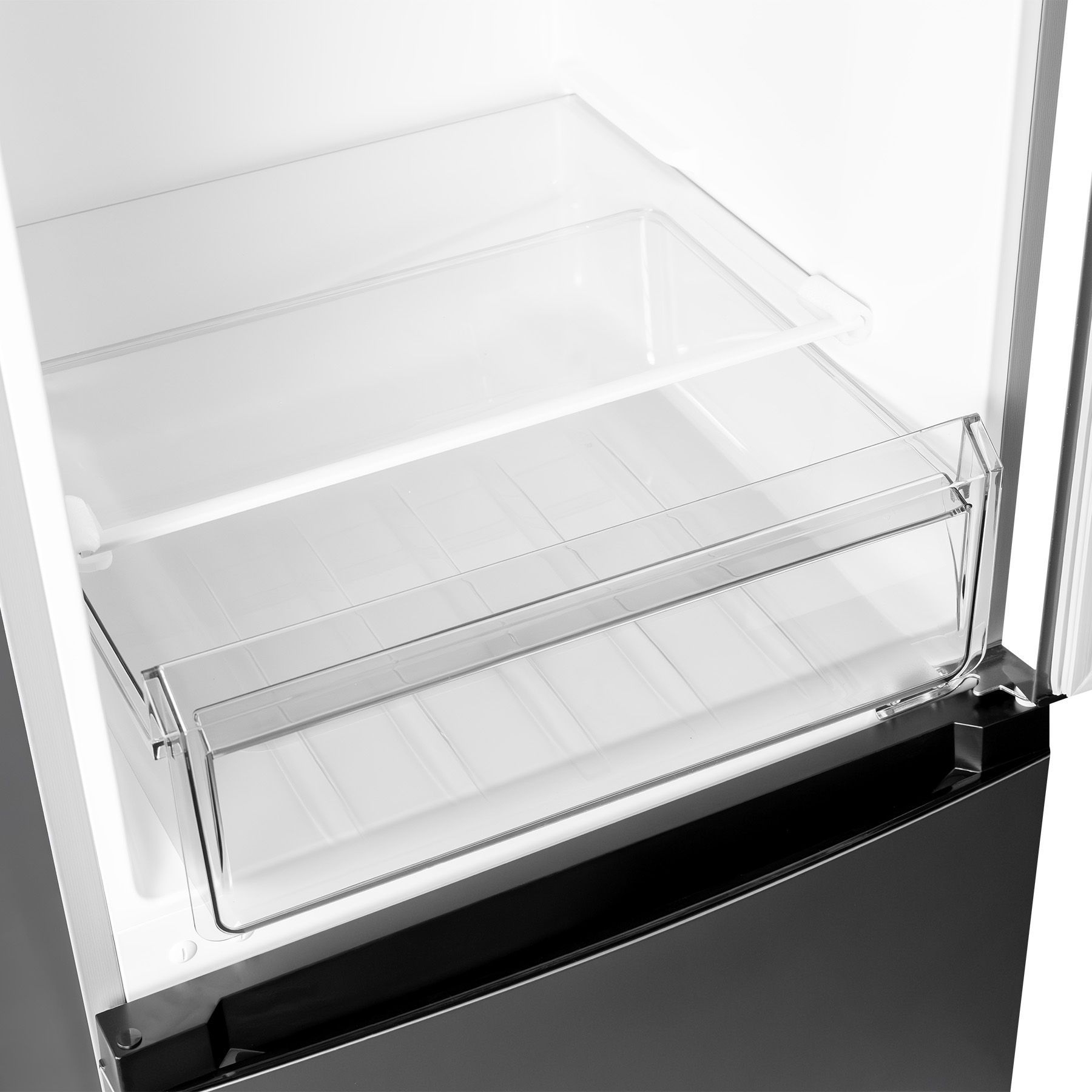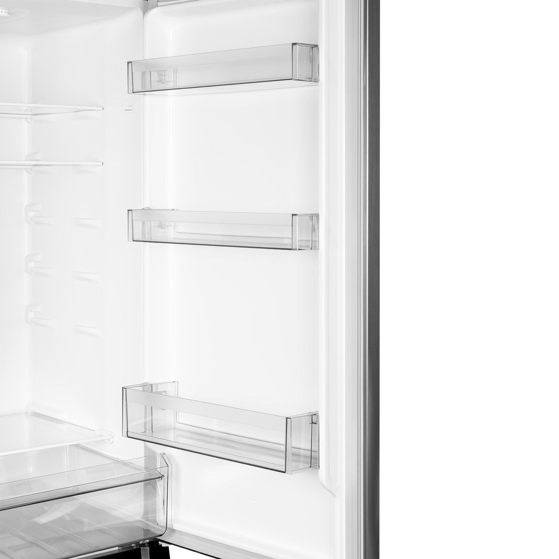 Холодильний відсік має напівпрозорий плафон лампи, що не перешкоджає LED-освітленню, яке розташоване зверху. Три полиці виконані зі скла з пластиковим огранюванням. Є три продуктові пластикові шухляди, один кріспер-бокс із пластику зі скляною кришкою та пластиковим обмеженням. Морозильна камера - це три ящики для заморожування продуктів. За бажання можна додати лоток морозилки, а за додаткову суму - підставку для заморожування льоду й окремий відсік для неї.