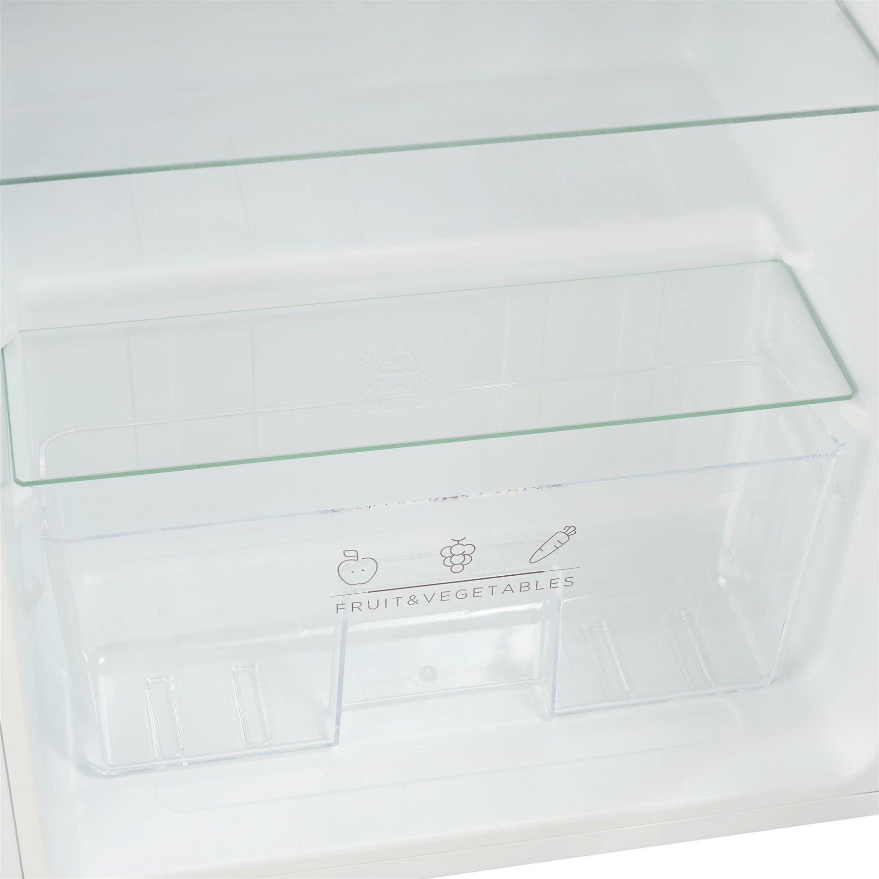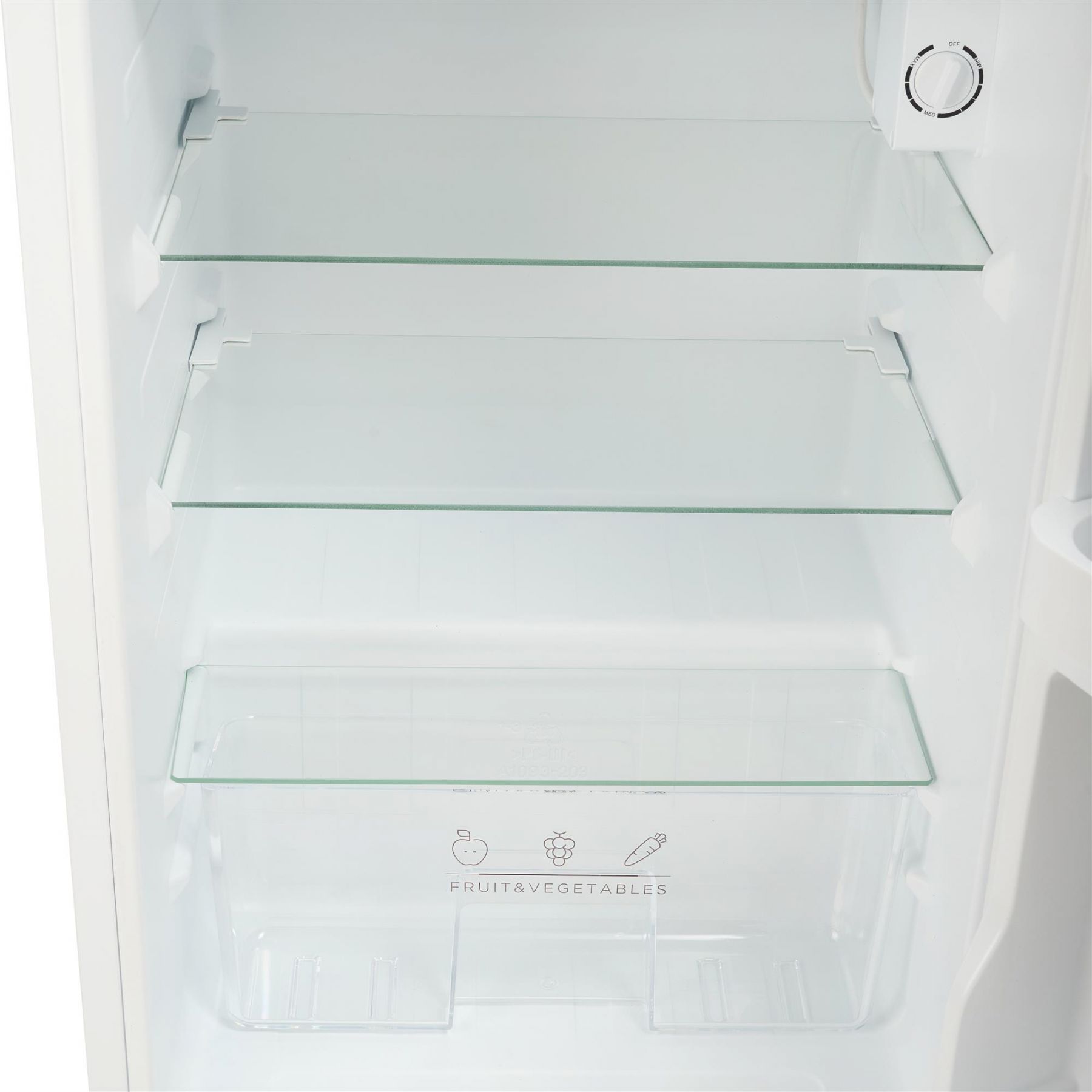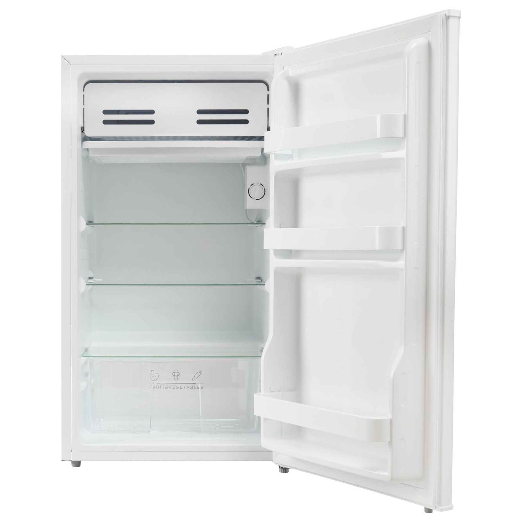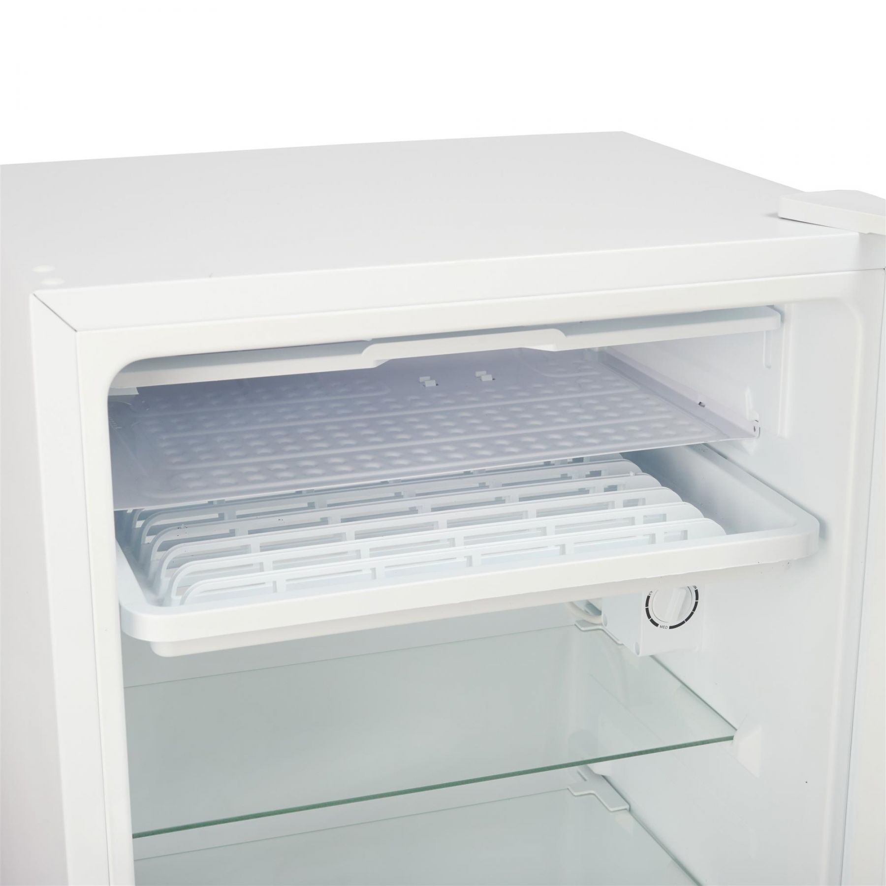 Дві полиці у вигляді металевих решіток можна встановити як вам зручно. Випарник типу De-frost (при досягненні потрібної температури відбувається автоматичне відключення охолодження, лід починає танути). Функції розморожування як такої не передбачено. Зливний піддон виконаний з поліпропілену і розташований внизу, щоб затримати зайву воду після процесу танення. Усередині холодильник освітлюється лампою.