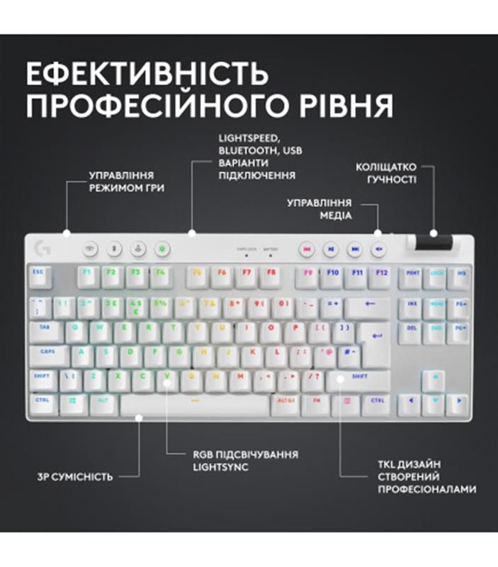 Клавiатура бездротова Logitech G PRO X TKL Lightspeed White Tactile (920-012148)