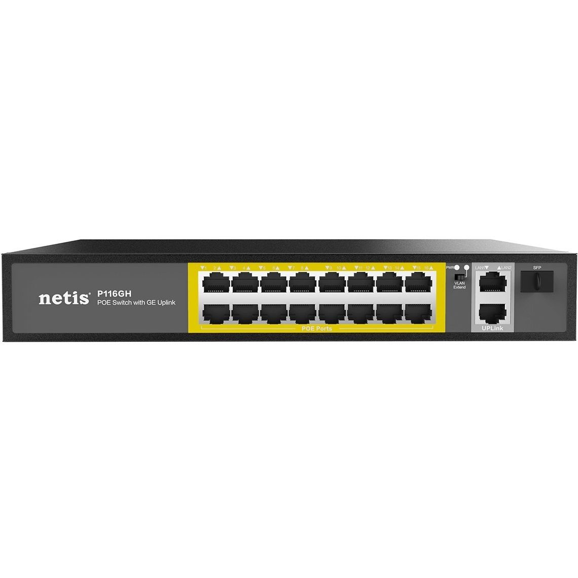 Стійковий комутатор netis P116GH є чудовим рішенням для створення домашньої чи офісної мережі. Він сумісний з камерами PoE, Wi-Fi точками доступу та іншим обладнанням, у тому числі без підтримки PoE для передачі даних в мережі. При цьому електроживлення та дані передаються по тому самому кабелю, що дозволяє підключити до мережі нові пристрої, розташовані далеко від ліній електроживлення або розеток. Всі 16 портів RJ45 (зі швидкістю 10/100 Мбіт/с) підтримують технологію живлення по Ethernet (PoE+), а для підключення до маршрутизатора, сервера або NVR служать 2 Гігабітні порти RJ45 і 1 SFP порт Uplink.