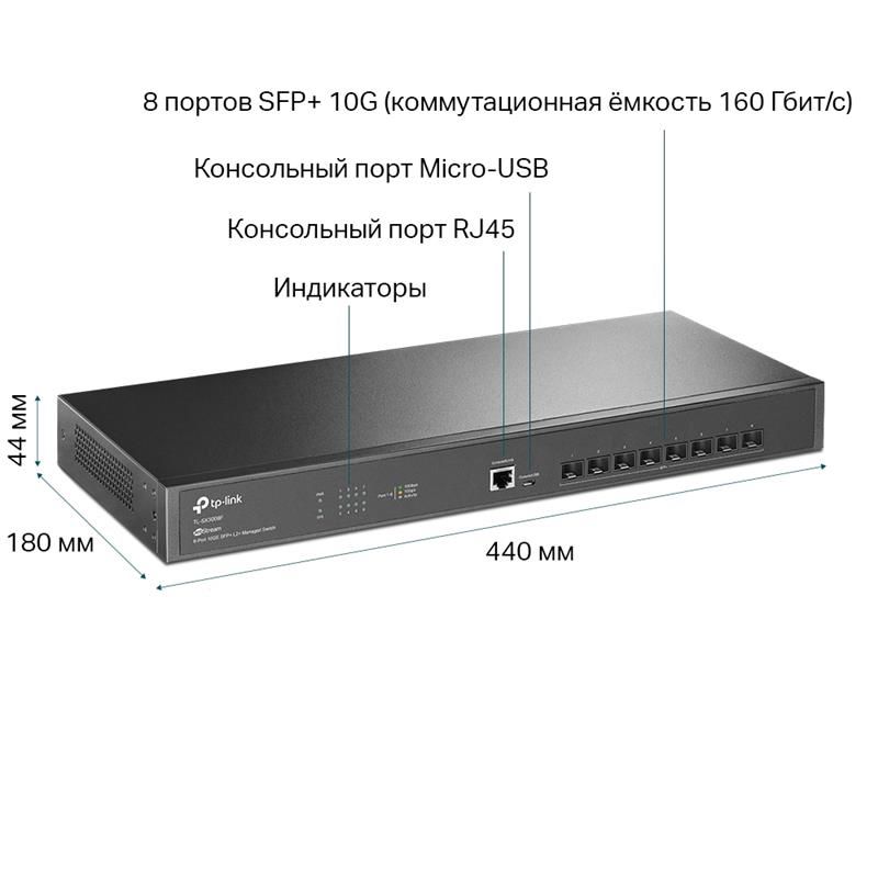 TP-Link TL-SX3008F – це керований комутатор на вісім оптичних 10G-портів з комутаційної ємністю 160 Гбіт/с, який ідеально підійде для бізнес-мереж будь-якого розміру і забезпечить максимальну швидкість і надійність.