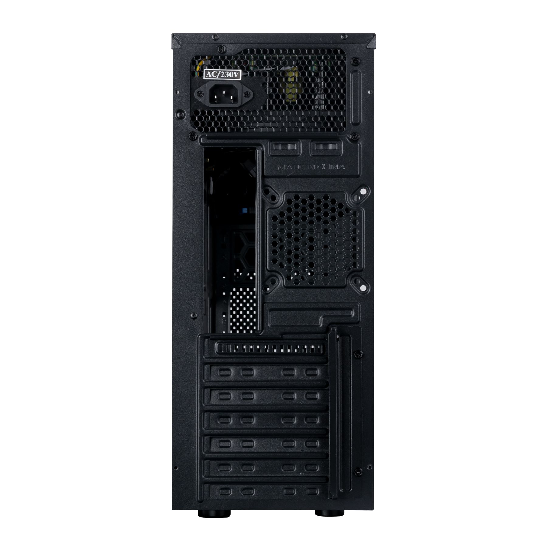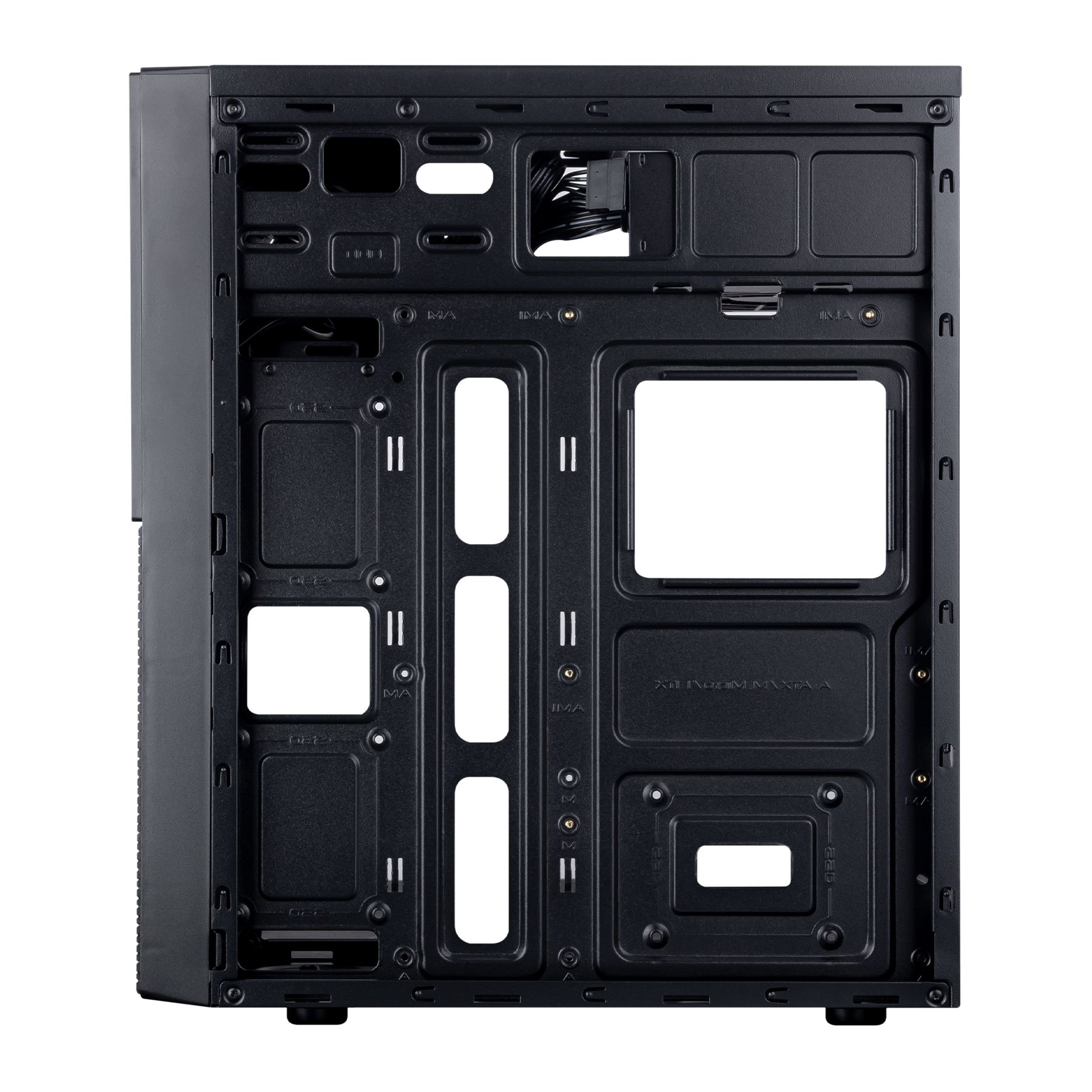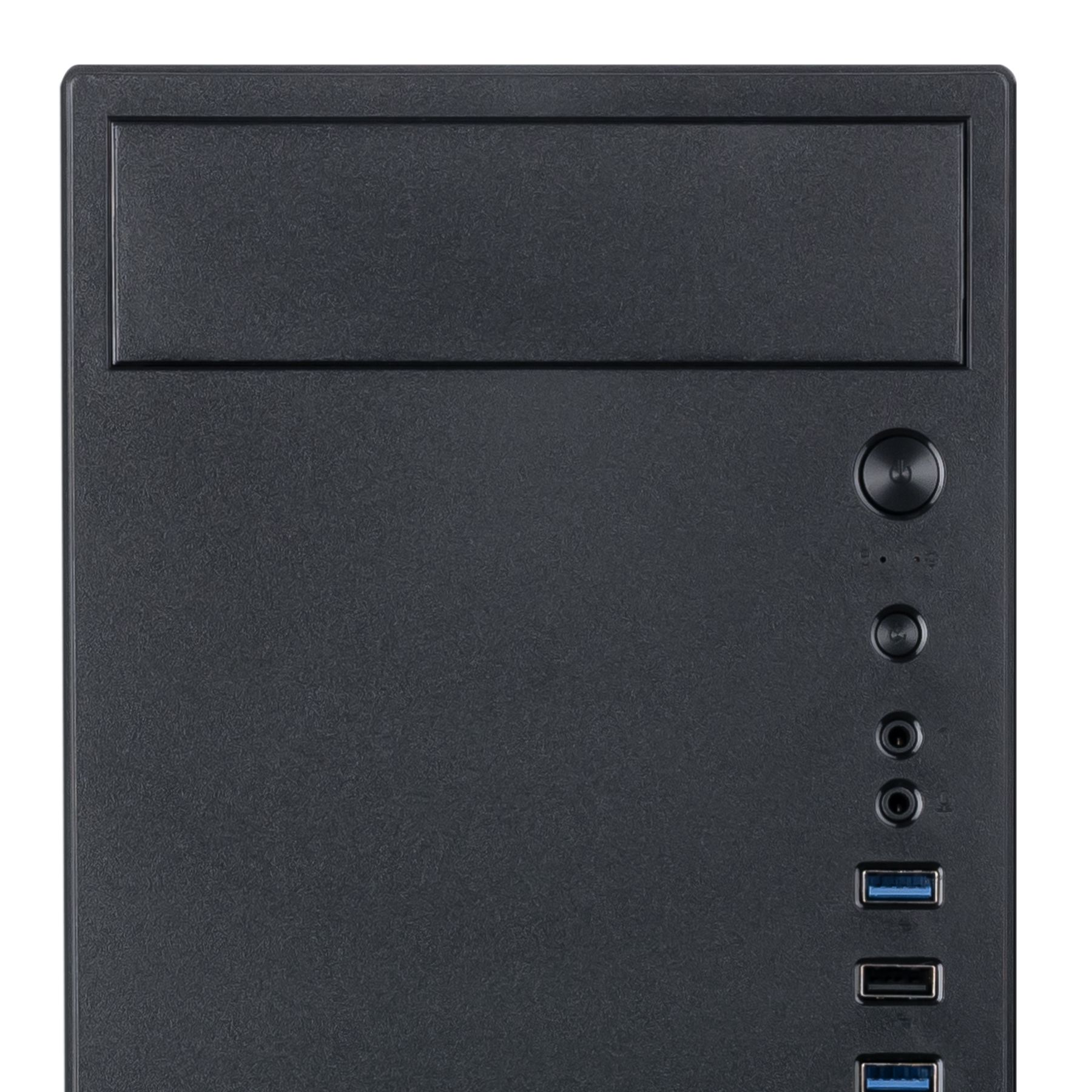 Виготовлений з листового металу завтовшки 0,4 мм, що надійно захищає компоненти від зовнішніх впливів. Бюджетна модель формату Miditower не займає зайвий простір і досить містка для монтажу всіх необхідних комплектуючих. Класичний дизайн елегантного чорного корпусу з сітковою перфорацією на бічній та фронтальній панелях, що забезпечує відмінну вентиляцію всередині корпуса. Два USB-порти 3.0 і роз’єм для під’єднання аудіогарнітури зручно розташовані на фасаді.