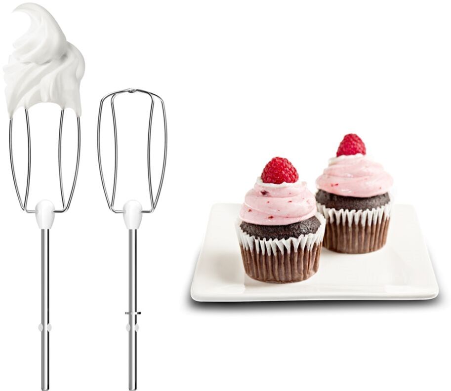 Користувачам точно сподобається ергономічна ручка, яка дуже зручно лежить у руці, та стабілізоване положення міксера, що допоможе уникнути бризок та підтримувати чистоту на кухні. І найголовніше, вінчики та гачки можна без проблем мити в посудомийній машині, щоби не марнувати на миття посуду більше сил та часу, ніж на приготування.