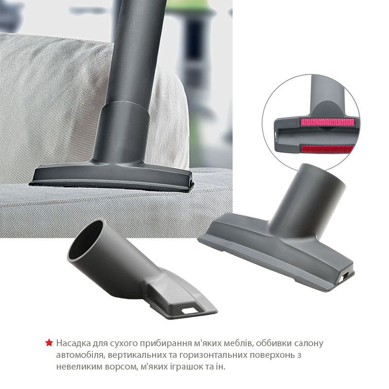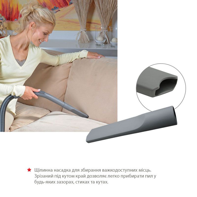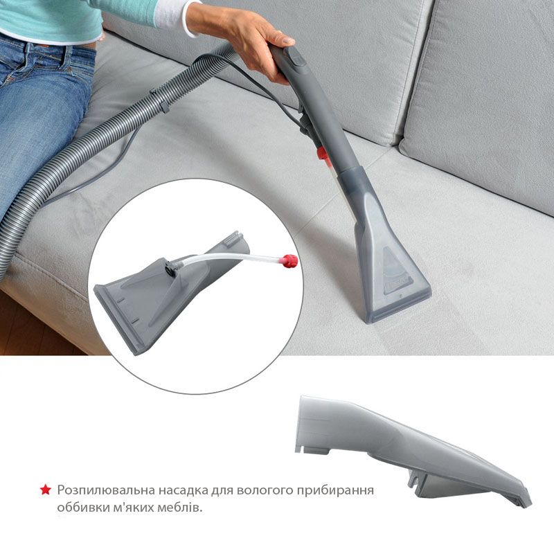 Пилосос відмінно справляється також з сухим і вологим прибиранням килимів і м"яких меблів. Він промиває килими до основи ворсу, знищує бруд і плями і надає текстильним поверхням свіжому, оновленому вигляду.