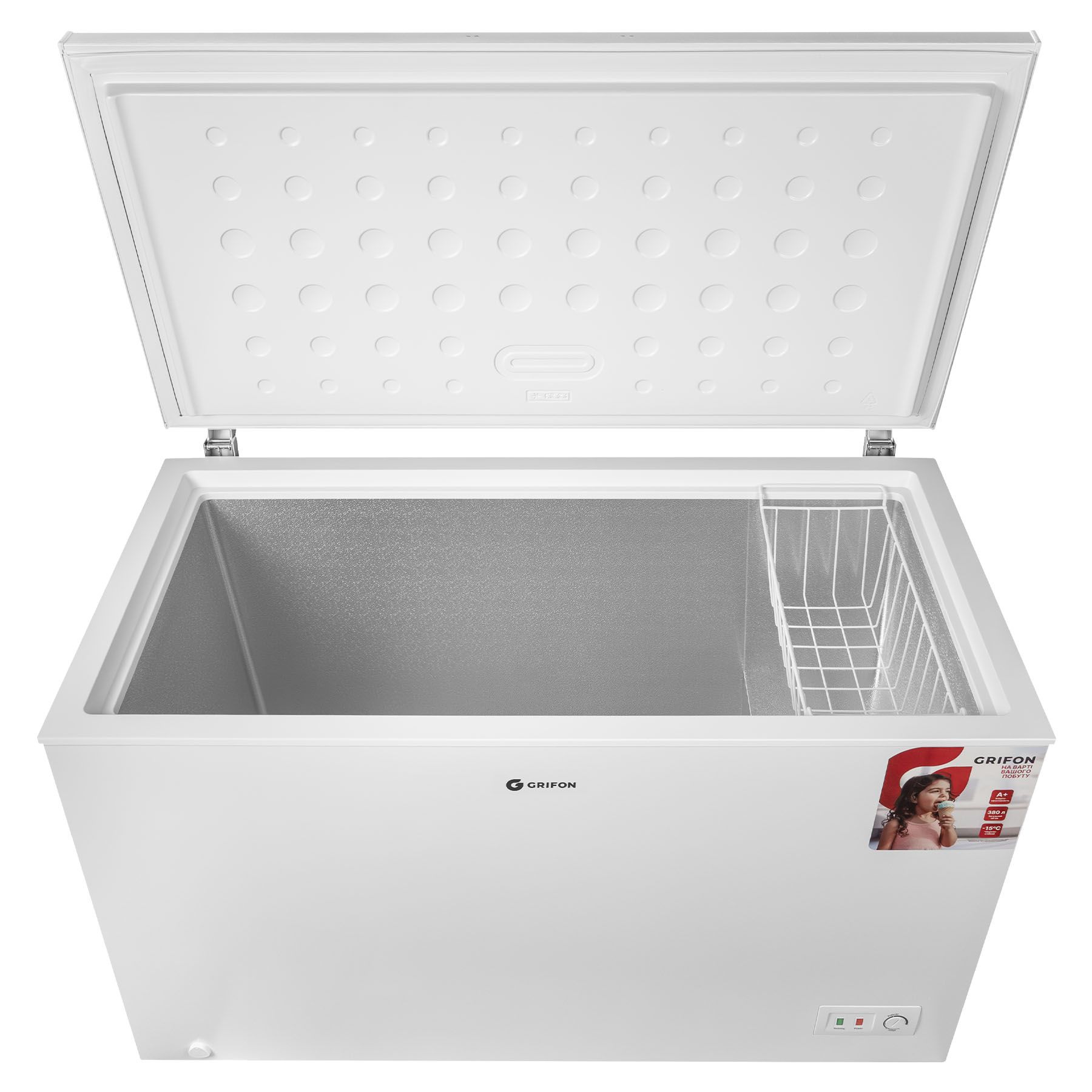 Всередині Grifon GRML-380M з легкістю можна розмістити всі необхідні продукти, адже її об’єм сягає 362 літрів. Крім того, скриня має два зручні навісні кошики, щоб легше було дістати те, що може знадобитися найближчим часом. Наприклад, морозиво для всієї родини. Для повноцінного замороження 17 кг продуктів знадобиться 24 години.