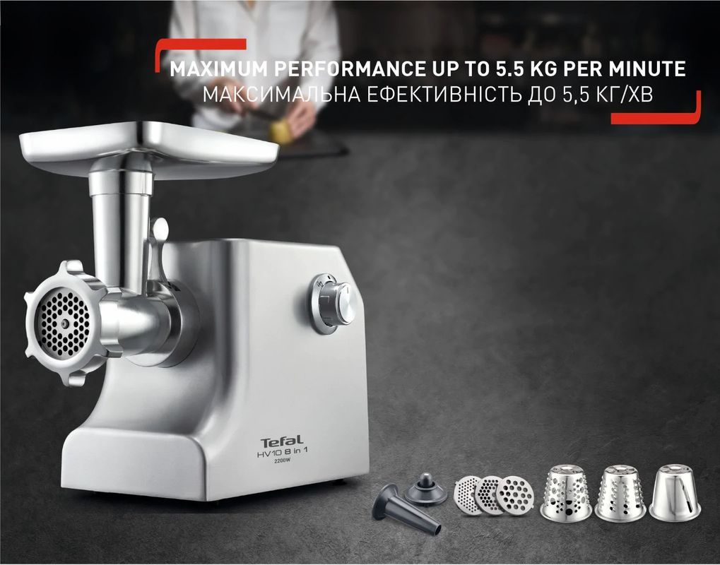 М'ясорубка Tefal HV10 8 IN1 NE858D38. З м'ясорубкою HV10 приготування свіжого фаршу відбувається швидко та легко. Її потужний двигун 2200 Вт забезпечує вражаючу продуктивність до 5,5 кг на хвилину, а набір аксесуарів забезпечує абсолютну універсальність та широкий спектр застосування – 8 кухонних інструментів в одному приладі. Від домашніх фрикадельок до смачних сосисок, смачного шашлику та соковитих котлет для гамбургерів – м'ясорубка HV10 допоможе вам.