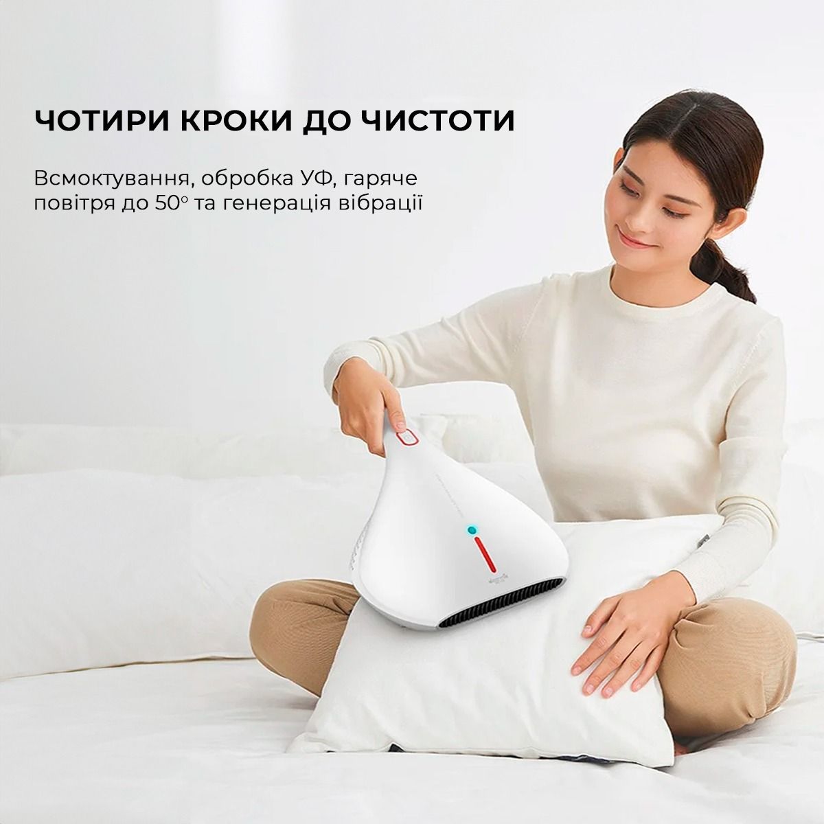 У пилососі Deerma поєднуються 4 ефективних способи боротьби з пиловими кліщами: світло, жар, вібрація та всмоктування. Комплексний захист включається всього однією кнопкою, швидко видаляючи всіх кліщів з тканини.