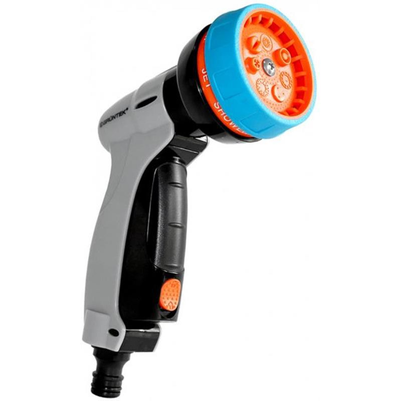 Пістолет для поливу легко регулює подавання води із 7 типами струменя: від точкового струменя до великого розпилення, що дає змогу виконувати різні типи робіт: від поливу до збирання. Є можливість зафіксувати кнопку увімкнення, полегшує напругу на руку в процесі поливу. Прискорює процес поливу садових рослин, допомагає силою напору змити навіть скам’янілий бруд із садового інвентарю й допомагає впоратися з побутовими завданнями на дачній ділянці, у саду.