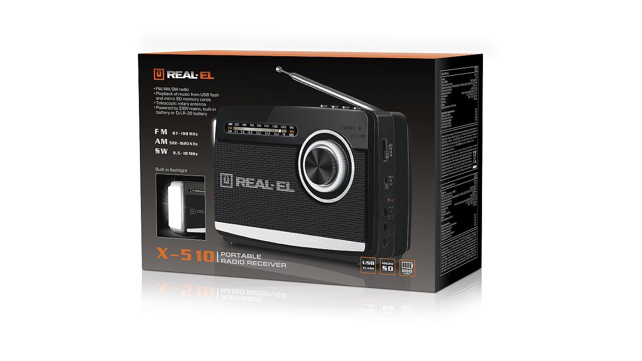 Лінійка радіоприймачів REAL-EL поповнилася моделлю REAL-EL X-510. Пристрій має вбудоване FM/AM/SW радіо, поворотну телескопічну антену, можливість відтворення музики з USB flash та microSD карт пам’яті та вбудовану батарею.