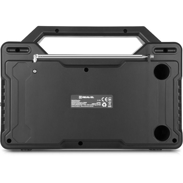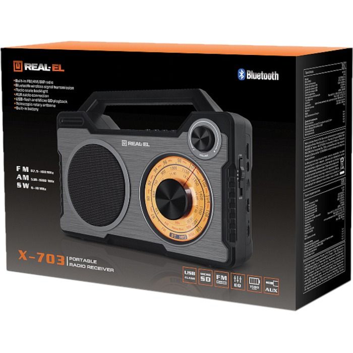 REAL-EL X-703 — не просто радіоприймач, а справжній мобільний аудіоцентр. Крім прийому радіопрограм, він може виступати в якості Bluetooth-колонки та підключатися до зовнішніх джерел сигналу за допомогою дроту. Наявність зовнішнього плеєра при цьому необов’язкове, пристрій підтримує відтворення MP3-файлів з накопичувачів USB-flash і карт microSD