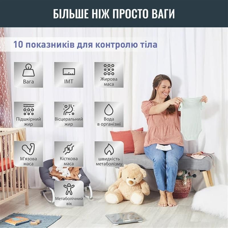 Відстежуйте не тільки вагу, а цілих 10 параметрів вашого тіла: вага, ІМТ, жирові відкладення, м’язова маса, маса кісток, рівень води в організмі, вісцеральний жир, підшкірний жир, рівень базального метаболізму та метаболічний вік.