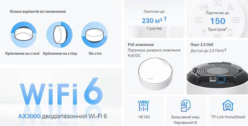 Мультисценарний Mesh WiFi відповідає всім потребам користувача. AX3000 Mesh для всього дому WiFi 6 система з PoE. Ідеально підходить для безперервних розваг. Обладнаний технологією Wi-Fi 6, mesh Wi-Fi для всього будинку Deco розроблено для значного збільшення покриття, швидкості та загальної ємності. Підключіться до найновішої mesh-мережі Wi-Fi, щоб насолоджуватися майбутньою мережею, яка завантажується швидше та з’єднує більше. Останній 1024-QAM підвищує швидкість до 3,0 Гбіт/с — ідеально підходить для завдань, які потребують великої пропускної здатності, як-от хмарні ігри та відео 8K. Насолоджуйтесь захоплюючими прямими трансляціями з бездоганним відео та чистим звуком без буферизації всією сім’єю.