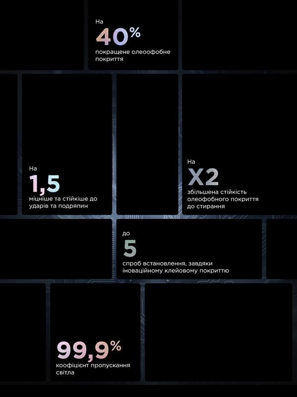 Покращена клейова основа преміумкласу нанесена по всій поверхні скла. І має antistatic властивість, завдяки цьому не притягує пил під час встановлення скла. Це дозволяє легко встановити скло без бульбашок повітря.