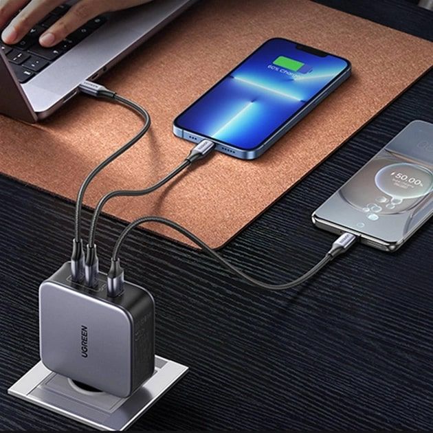 Два порти USB-C і один порт USB-A підтримують одночасне заряджання двох ноутбуків і телефона зі швидкістю, потрібною для користувача, який працює з кількома пристроями. 5 футів 240 Вт шнур для швидкої зарядки Type-C в комплекті.