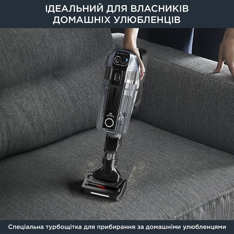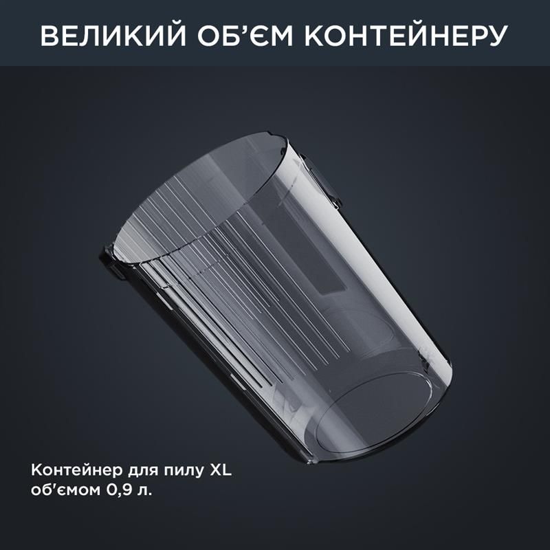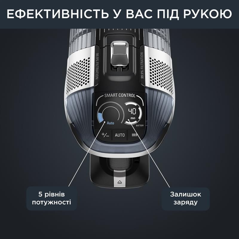 Потужність всмоктування до 200 Вт повітря (у режимі Boost), автономність до 1 години 10 хвилин (у разі використання ручного пилососа в режимі Eco), вдосконалена фільтрація до 99,9% пилу й алергенів.