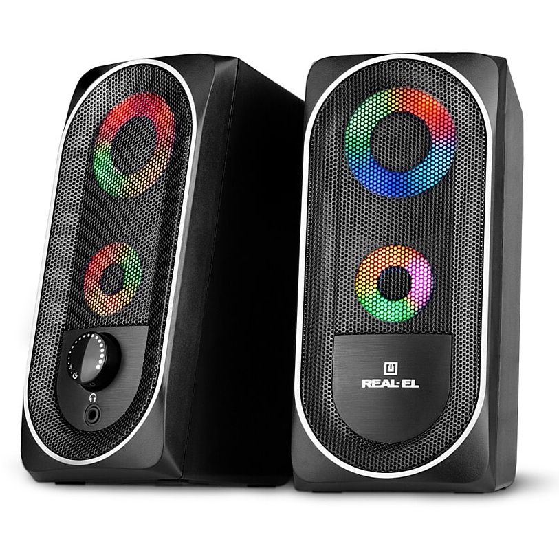 Мультимедійна акустична система REAL-EL S-110 – легке й доступне вирішення питання озвучування комп"ютера (ноутбука). АС оснащена вмонтованими підсилювачем, акустичним та сигнальним кабелями, завдяки чому може бути підключена практично до будь-яких джерел аудіосигналу. Живлення АС здійснюється через USB-порт ПК, ноутбука або блок 5V DC за допомогою вмонтованого USB-кабелю живлення.