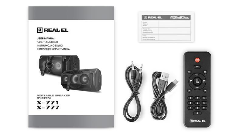 Мультимедійна портативна акустична система REAL-EL X-771 має сучасний дизайн із якісним звучанням. Широкий функціонал "бумбоксу" дозволяє прослуховувати музику підключаючи мобільний пристрій, ПК, TV, ноутбуки тощо, як через виведення AUX, так і через Bluetooth. USB та Micro SD card рознімання дають можливість прослуховувати аудіо-файли з flash носіїв. X-771 відмінний супутник для відпочинку на природі, літій-іонний акумулятор на 8000 mAh забезпечить вас музикою на тривалий час.