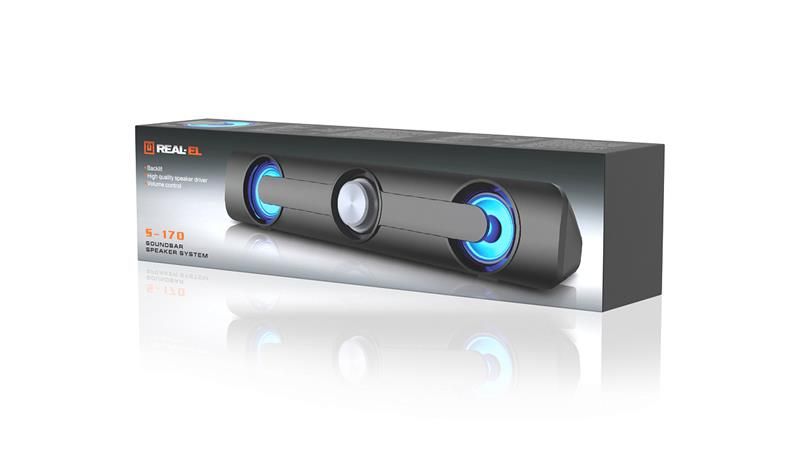 Акустична система REAL-EL S-170 оснащена вмонтованими підсилювачем, кабелем живлення та сигнальним кабелями, завдяки чому може бути підключена практично до будь-яких джерел аудіосигналу. Живлення саундбару здійснюється через USB-порт 5V DC за допомогою вмонтованого USB-кабелю живлення.