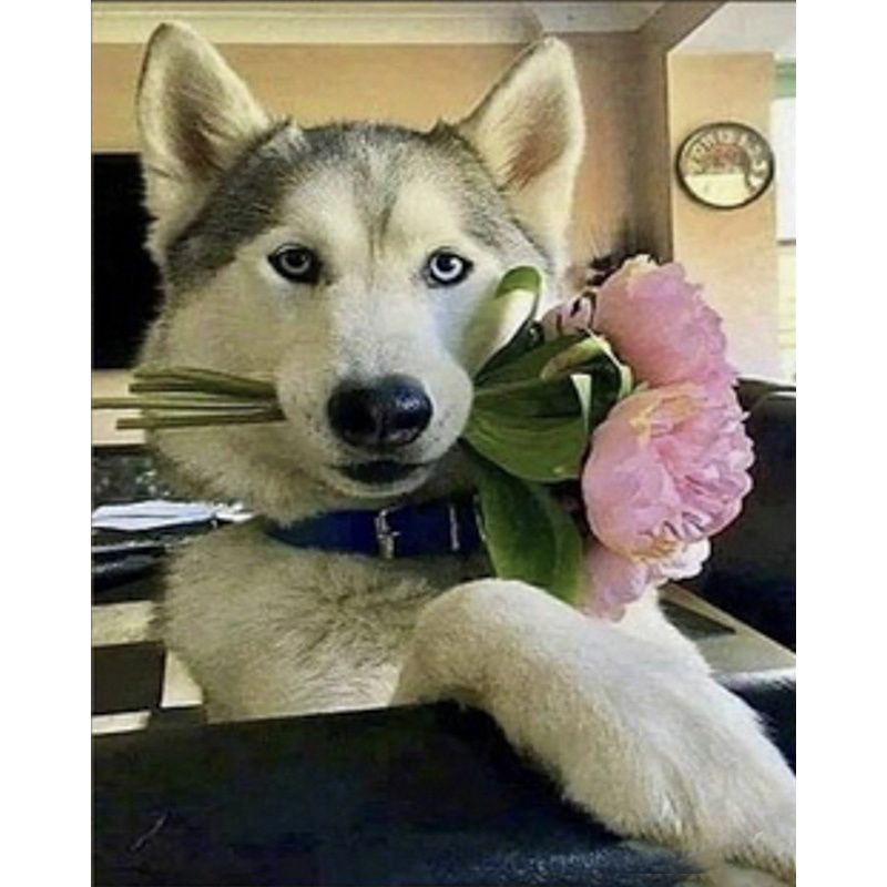 Алмазна мозаїка Strateg ПРЕМІУМ Хаскі з квітами розміром 30х40 см (HEG86055)