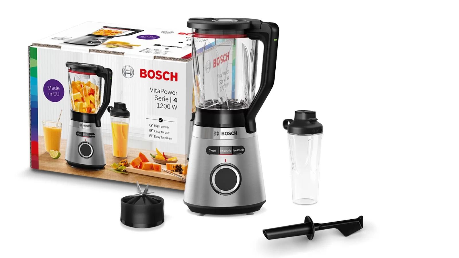 Довговічність приладу підтверджена внутрішніми тестами: 100 годин використання й 10.000 приготованих чашок смузі. Ця висока продуктивність забезпечується високоякісними матеріалами, європейським виробництвом та багаторічним досвідом Bosch.
