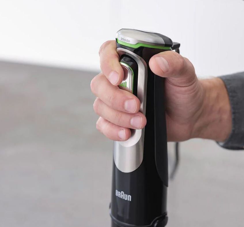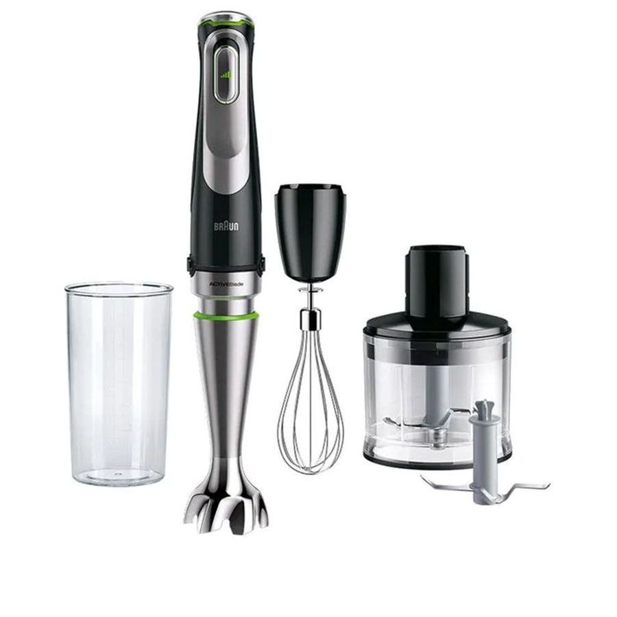 Занурювальний блендер серії MultiQuick 9. Максимальна потужність моторного блоку: 1200 Вт. Кількість швидкостей: регульована. У комплектацію входить: моторний блок із системою EasyClick Plus та технологією SmartSpeed; металева блендерна ніжка з гострими ножами з нержавіючої сталі, виконана за технологією ActiveBlade, PowerBell Plus та SplashControl; насадка подрібнювач на 0,5 л із додатковим ножем для колки льоду; вінчик для збивання та перемішування; мірна склянка з чіткою мірною шкалою на 600 мл.