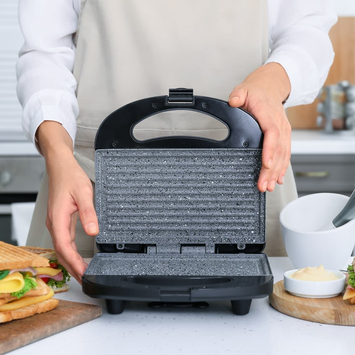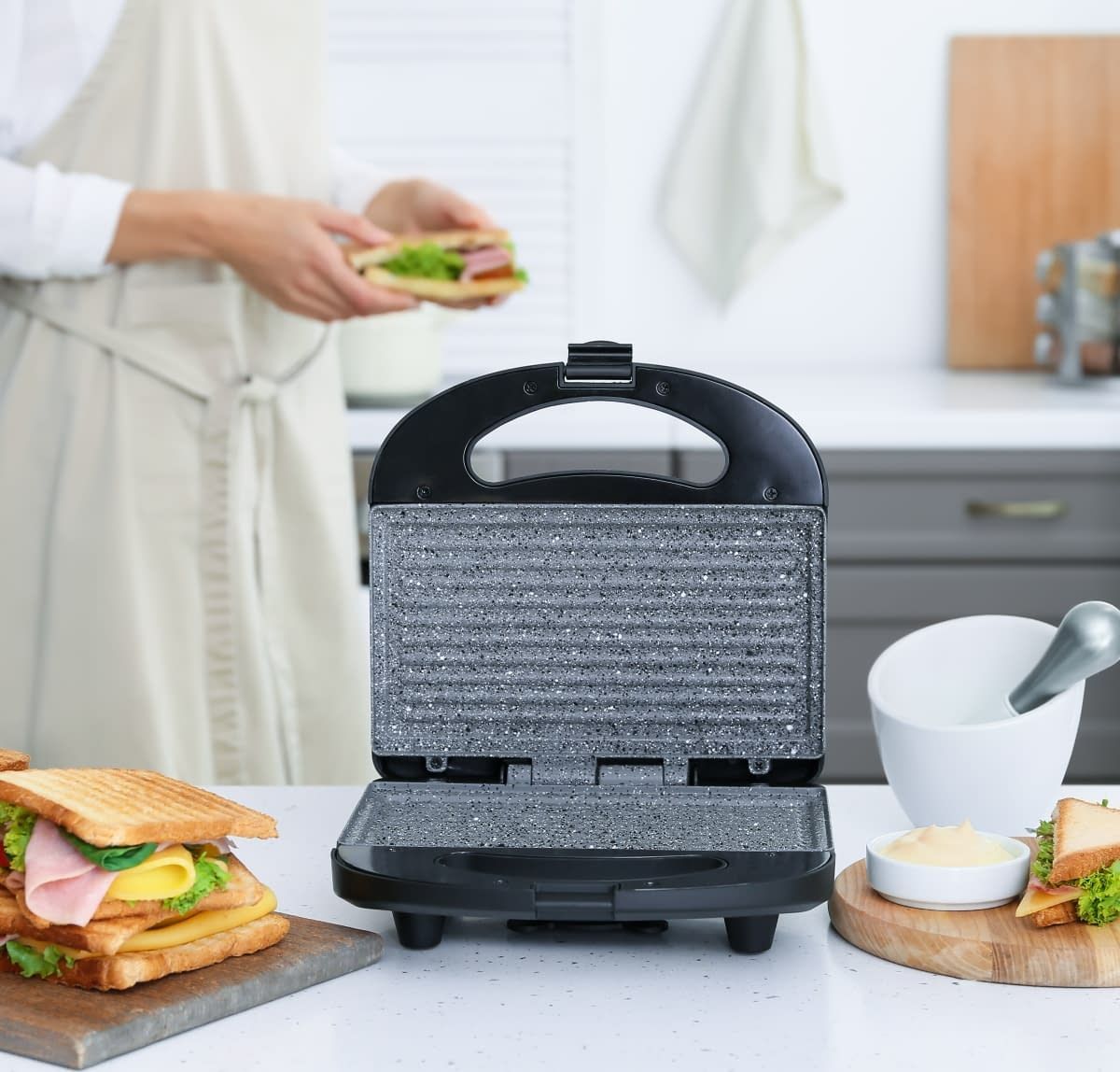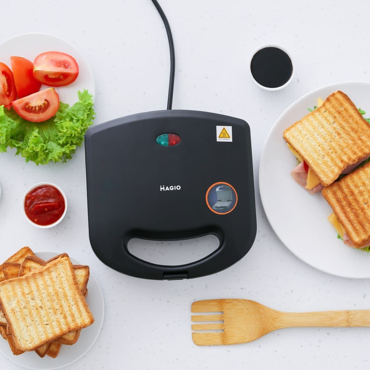 Бутербродниця MG-367 має всі необхідні функції для того, щоб швидко приготувати смачні та поживні сендвічі. Одночасно в ній можна випікати відразу по 4 сендвічі, краї яких щільно зліплюються бортиками форм, надійно зберігаючи начинку всередині. Корпус виготовлений із високоякісного термостійкого пластика чорного кольору. Тип деко – підсмажений сендвіч. Нагрівальний елемент потужністю 656 Вт забезпечує швидке та рівномірне нагрівання двох робочих поверхонь з керамічним покриттям. Бутербродниці Magio дуже зручні в користуванні, сендвічі та вафлі не підгорають і легко витягуються. Завдяки компактним розмірам та фіксатору бутербродницю зручно зберігати. На кришці є світлові індикатори живлення та готовності до роботи, що полегшує контроль процесу приготування.