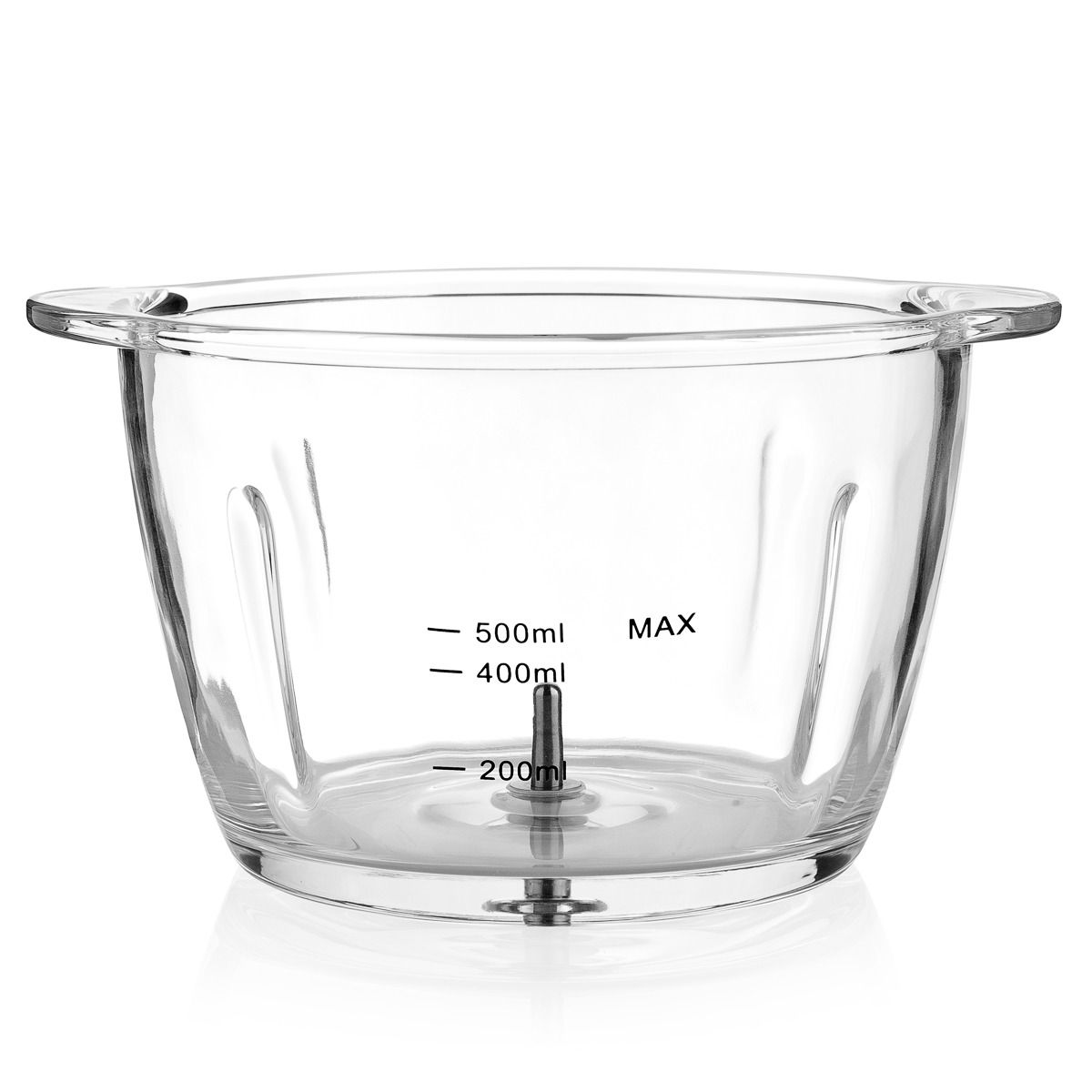 Містка скляна чаша об’ємом 1,2 л дозволяє зручно готувати різні інгредієнти, при цьому вона стійка до запахів і легко миється. Подвійний ніж із нержавіючої сталі забезпечує якісне подрібнення навіть твердих продуктів.