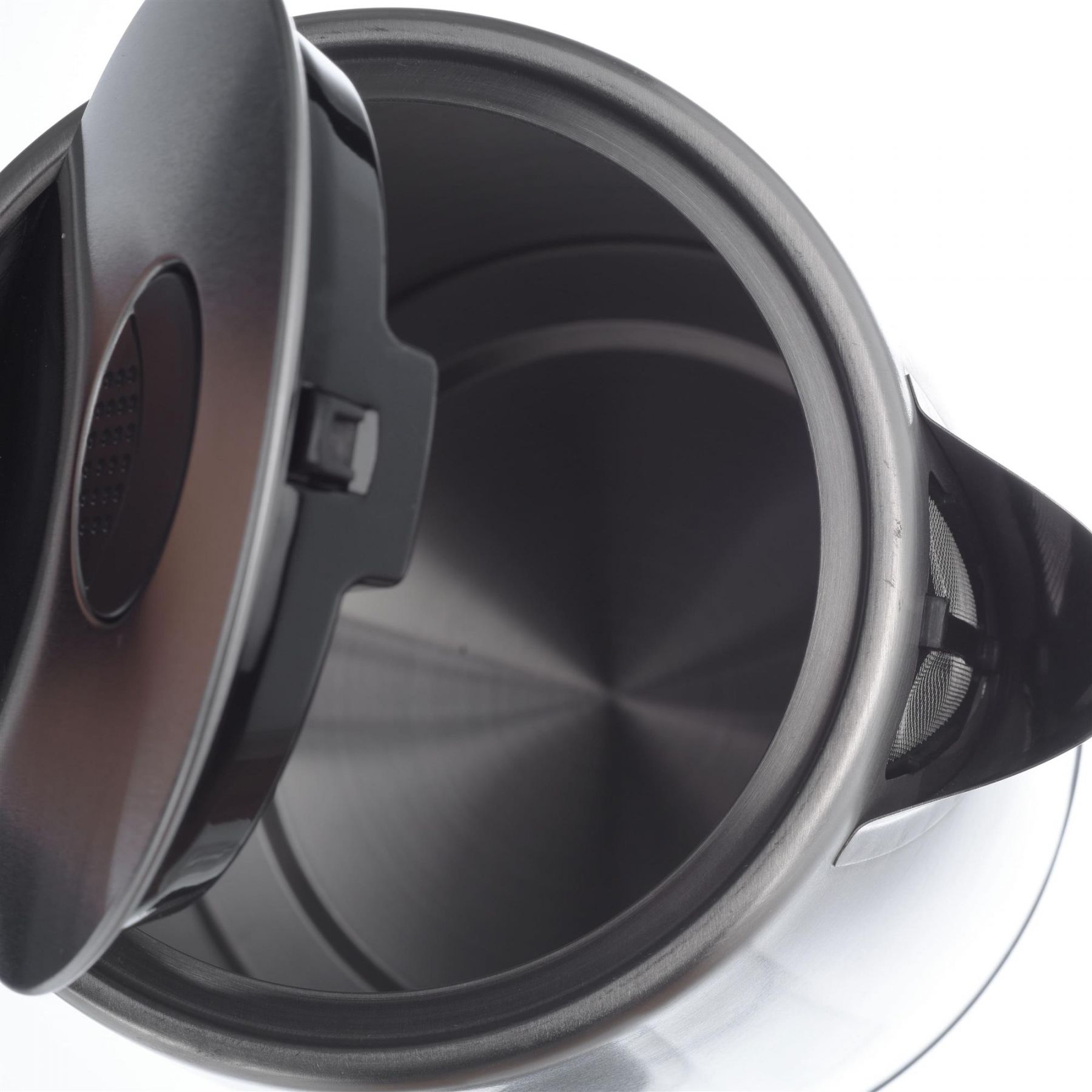 Корпус електрочайника First FA 5411-2 виготовлений з нержавіючої сталі та термостійкого пластику чорного кольору. Метал більш стійкий до високих температур, ніж пластик, і виділяє у воду токсичні речовини. Крім того, він міцніший, виглядає технологічніше. Загалом даної моделі характерний стильний та сучасний дизайн, який не тільки впишеться в інтер'єр Вашої кухні, а може стати важливим елементом її декору. Ергономічна ручка чайника зручно лежить у руці. На ній розташована кнопка увімкнення/вимкнення пристрою, а на нижній частині корпусу знаходиться червоний світловий індикатор живлення.