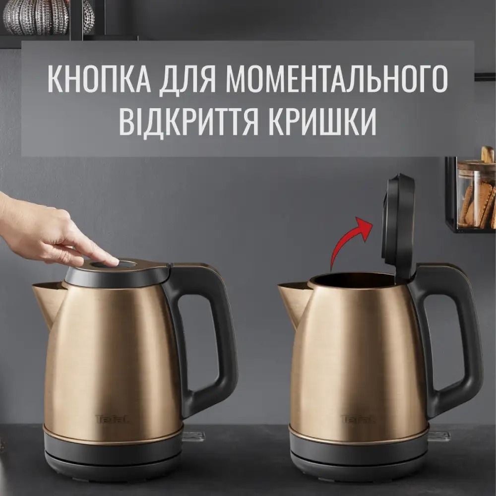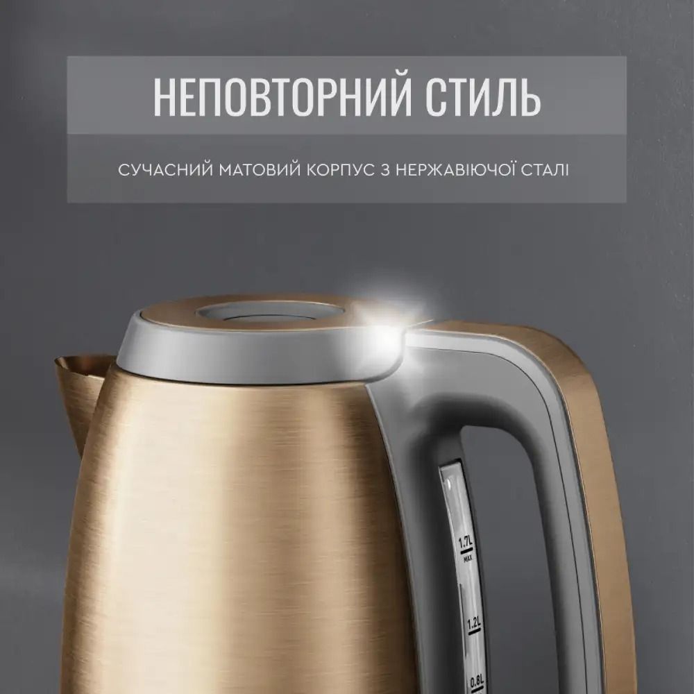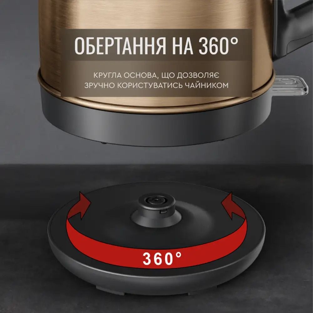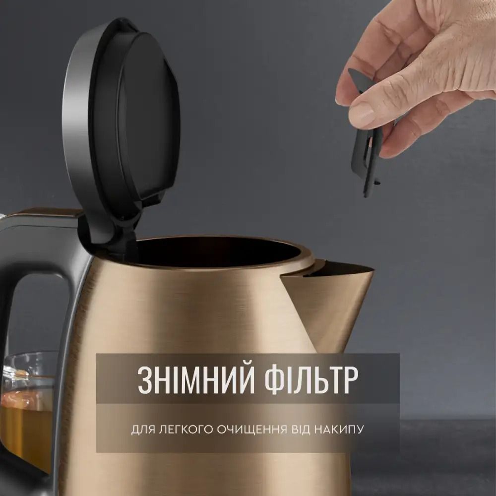 Потужний і об’ємний чайник спроектований для найбільшої зручності використання, завдяки спеціальному носику вода не проливається. Вбудований в ручку індикатор дозволить стежити за рівнем води в чайнику, а знімний фільтр проти накипу збереже воду кристально чистою.