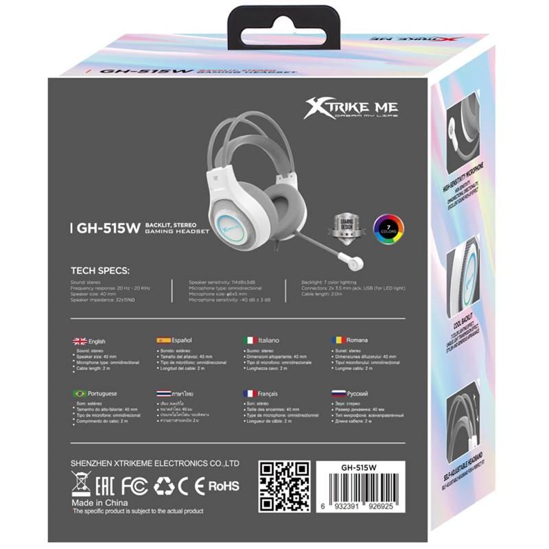 Ігрова гарнітура XTRIKE ME GH-515 виконана у стильному поєднанні білого і сірого кольорів. Її дизайн вдало доповнений дизайні, який вдало доповнений світлодіодним підсвічуванням з логотипом.