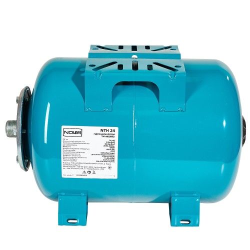Гідроакумулятор 24л NOWA NTH 24 – це сталевий бак, усередині якого встановлена еластична мембрана, яка має форму колби й поділяє об’єм бака на дві частини. В одній частині (в мембрані) міститься вода, в іншій – повітря під тиском. Коли насос увімкнений, вода заповнює еластичну мембрану і стискає повітря в іншій частині бака. Якщо насос вимкнений, стиснене повітря витісняє воду з мембрани, підтримуючи заданий тиск у системі до моменту автоматичного увімкнення насоса.