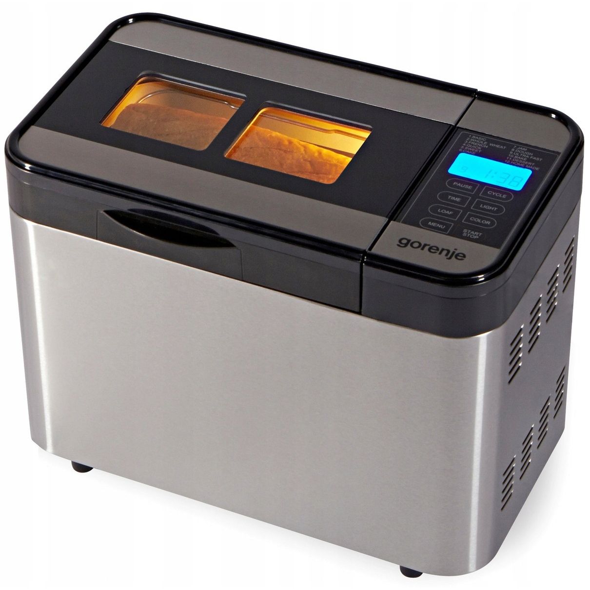Чудова хлібопічка Gorenje BM 1400 E (BM1400E) при своїх досить компактних розмірах володіє багатим функціоналом, завдяки чому і користується популярністю у споживача. Стильний дизайн доповнить інтер"єр будь-якої кухні, а просте і зрозуміле управління Touch control в комплекті з дисплеєм не викличе складнощів у будь-якого користувача. Крім цього в цій моделі пропонується на вибір 12 різноманітних програм і зручна функція відстрочки старту, в ній є практичне вікно, яке, в поєднанні з підсвічуванням, дозволить максимально контролювати процес приготування і спостерігати за тим, що відбувається всередині.