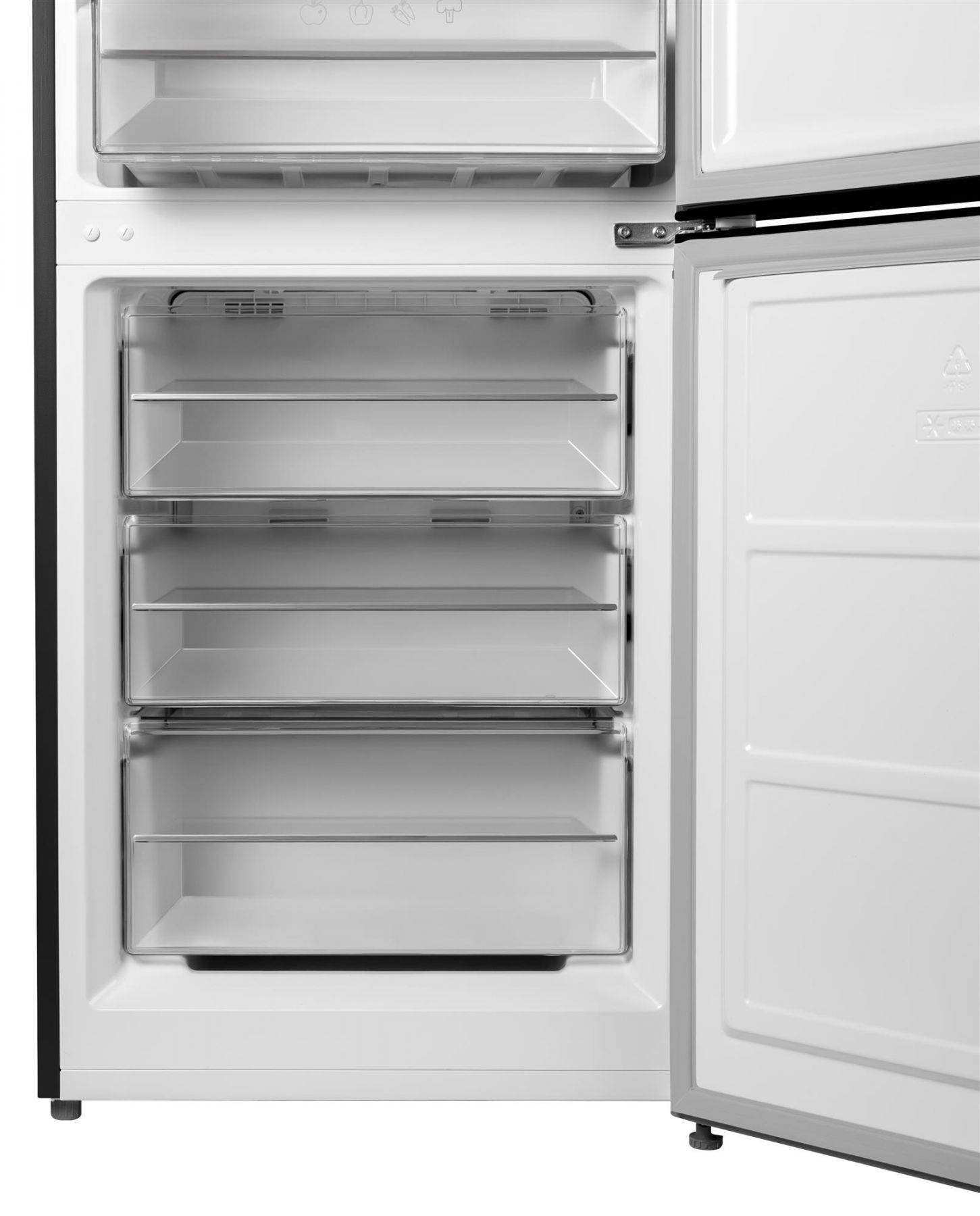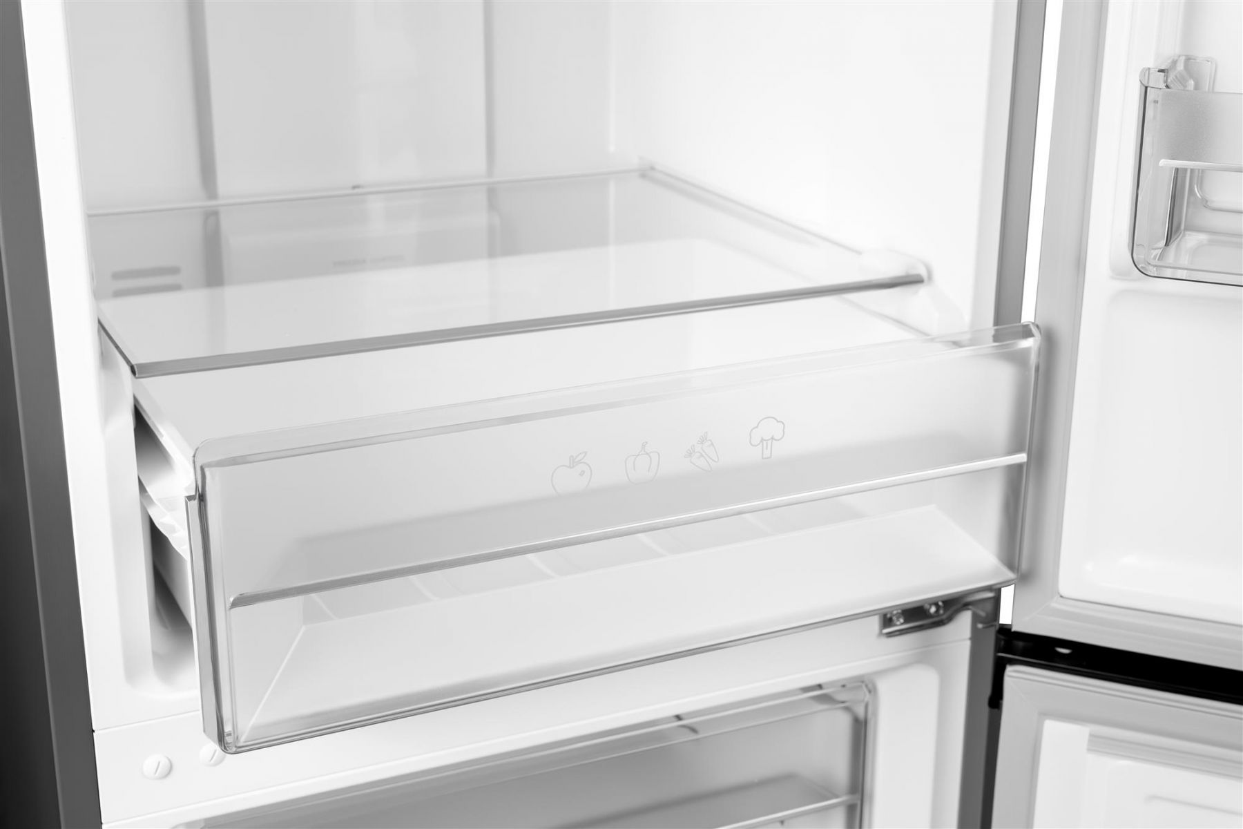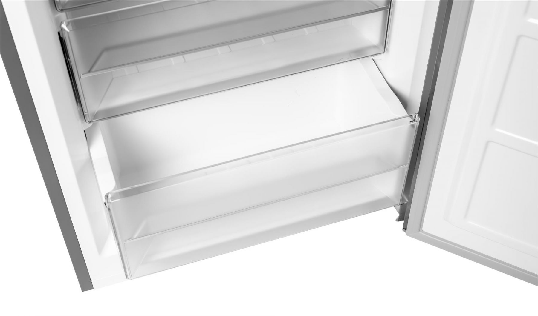Основний відділ холодильника розрахований на 224,4 літра та має чотири полиці з загартованого скла. На них можна розмістити необхідні продукти, а якщо щось не вміщається по габаритах — висота полиць регулюється. Тут же знизу є шафа для свіжих овочів та фруктів, де зберігається рівномірна температура. Широкі та глибокі кармани на дверцятах допоможуть безпечно зберігати пляшки та картонні пакети. Усього 5 карманів — два великих та три поменше.