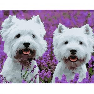 Картина за номерами Strateg ПРЕМІУМ Два білих тер'єра з лаком розміром 40х50 см (SY6867)
