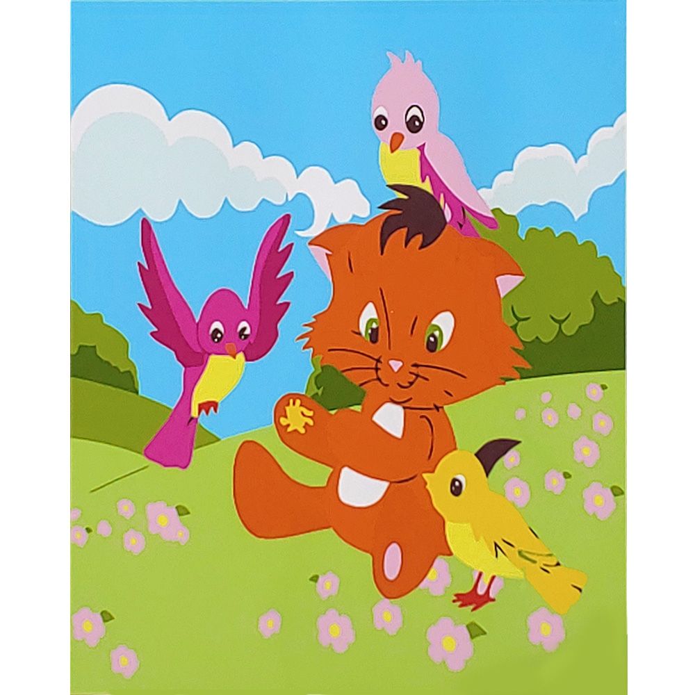 Картина за номерами Strateg ПРЕМІУМ Грайливе котеня з пташками з лаком та з рівнем розміром 30х30 см (ES194)