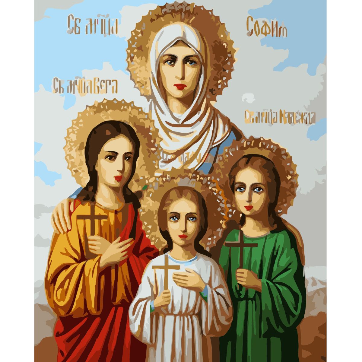 Картина за номерами Strateg ПРЕМІУМ Ікона Віри, Надії, Любові та їх матері Софії з лаком розміром 40х50 см VA-3550