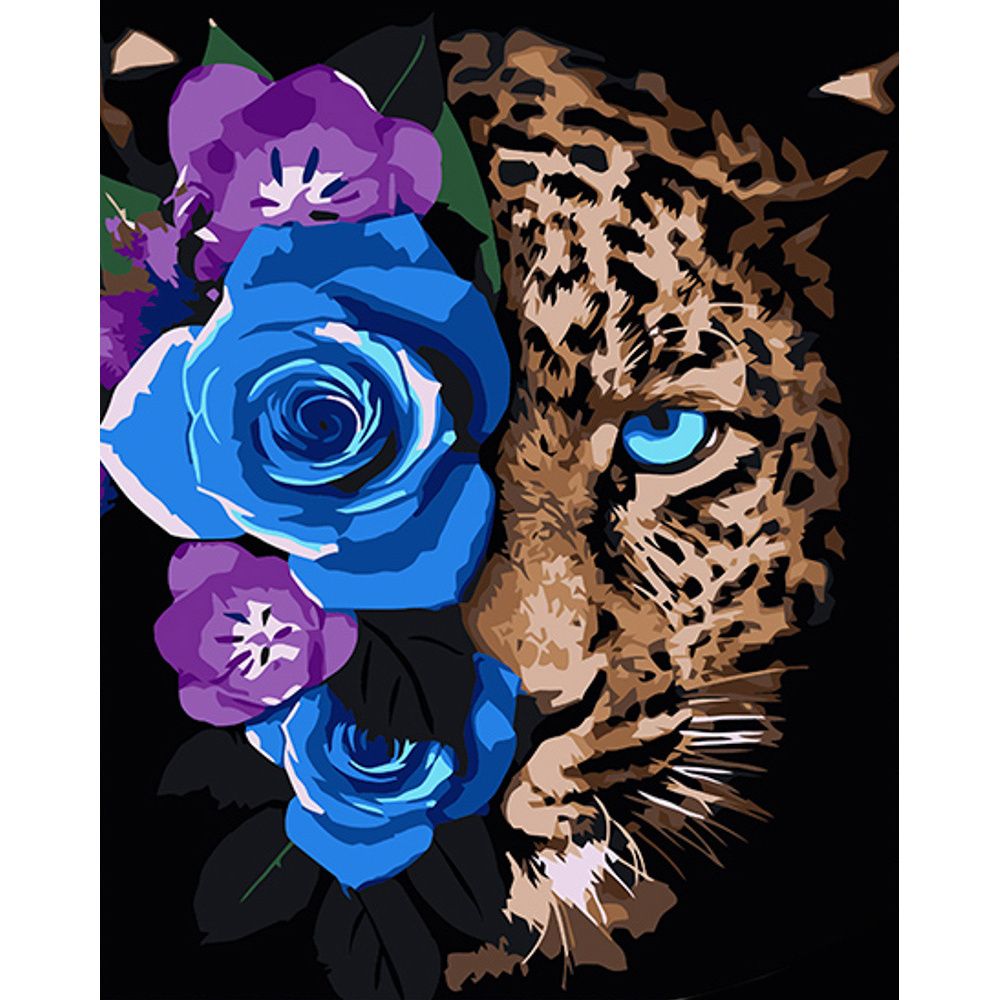 Картина за номерами Strateg ПРЕМІУМ Леопард у квітах на чорному фоні розміром 40х50 см (AH1033)