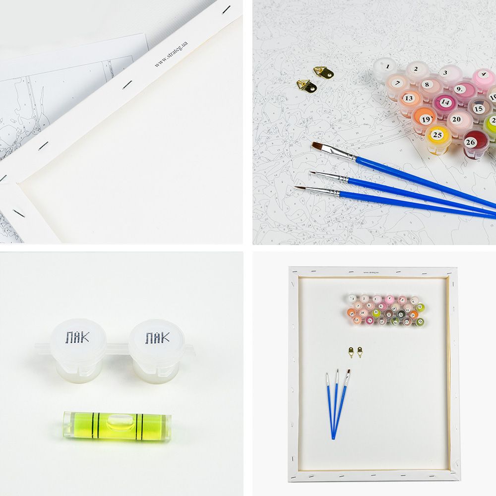 Комплектація:Контейнери з акриловими фарбами; синтетичні пензлики (3 шт.), зразок картини; полотно із розбивкою зображення за номерами; підрамник; кріплення;лак.