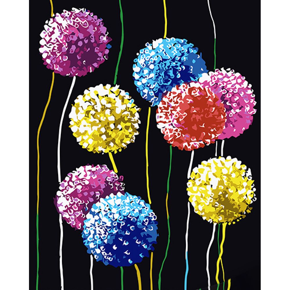 Картина за номерами Strateg ПРЕМІУМ Яскраві кульбаби на чорному фоні розміром 40х50 см (AH1013)