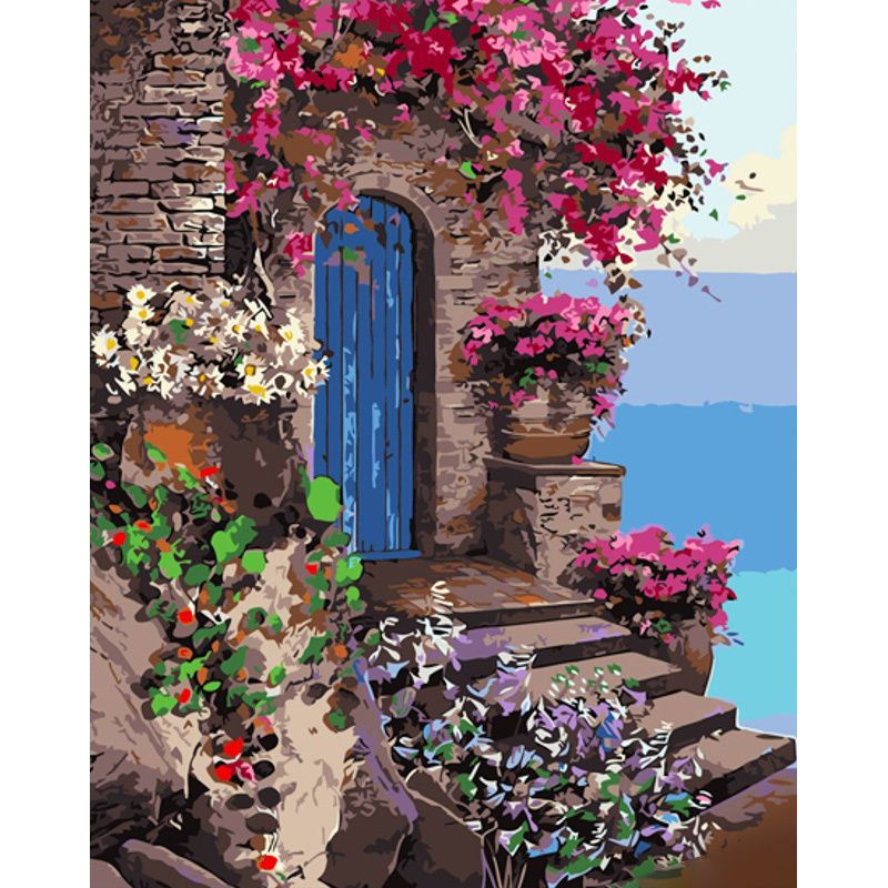 Картина за номерами Strateg ПРЕМІУМ Заквітчений ґанок з лаком та з рівнем розміром 40х50 см (GS1462)