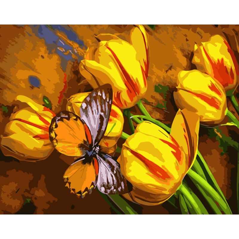 Картина за номерами Strateg ПРЕМІУМ Жовті тюльпани з метеликом розміром 40х50 см (GS1019)